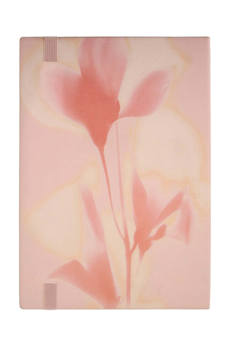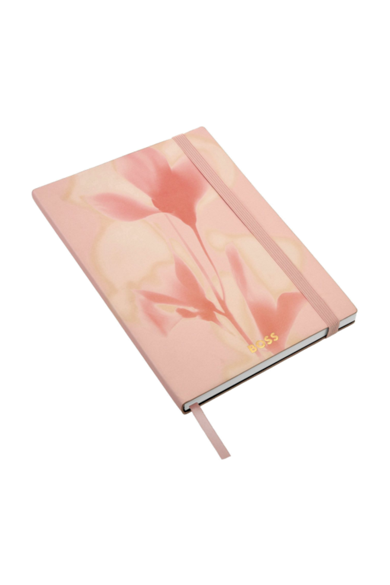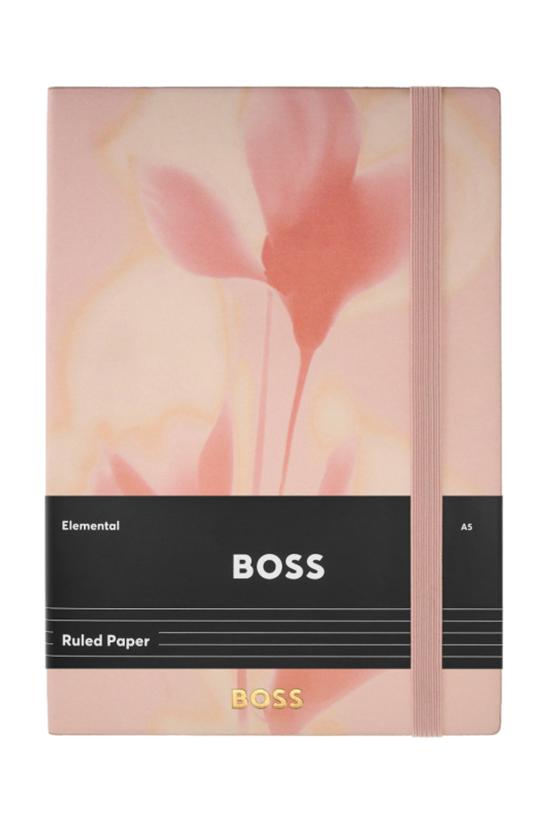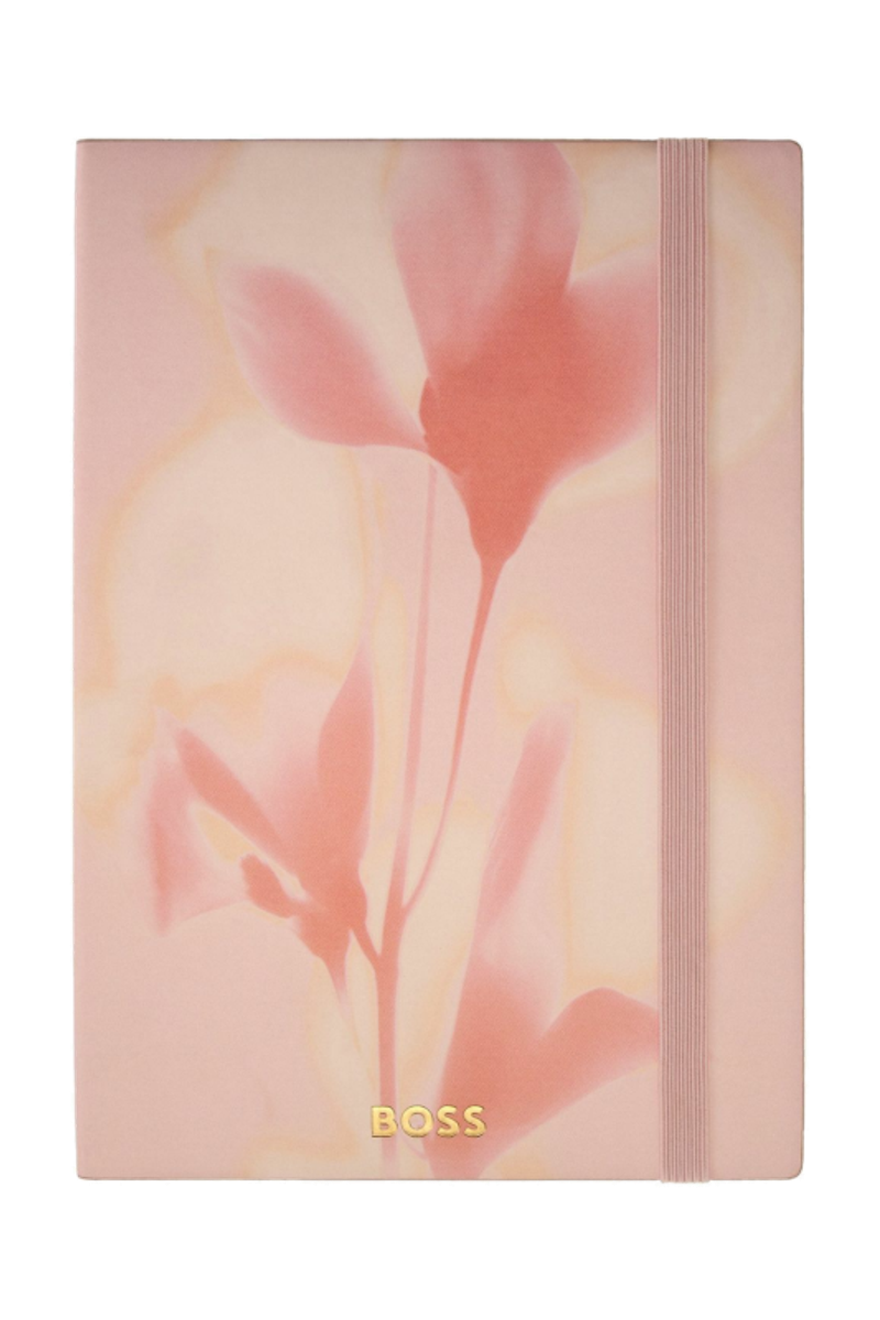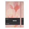 The Holographic notebook features a soft, blurred floral print inspired by the BOSS Lady ready-to-wear line, giving the design a light and airy visual character. Offered in a soothing palette of navy, light blue, nude, and pastel green, each version brings a sense of subtle delicacy and modern elegance. The cover is finished with a BOSS logo embossed and highlighted with gold foil, while a vertical elastic closure and matching page marker echo the tones of the print for a cohesive finish. Each notebook is presented in an A5 format with lined paper and contains 192 pages, combining visual softness with everyday functionality.
