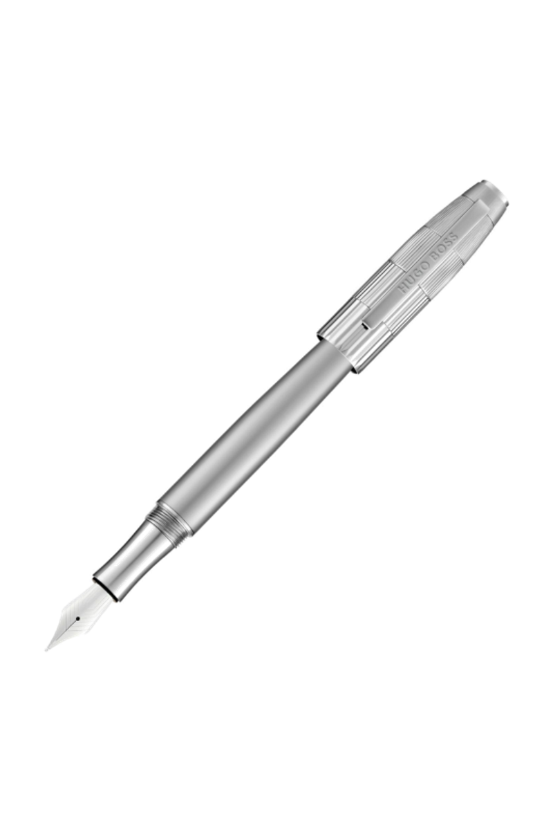 The Striato pen line celebrates the graphical play on stripes that defines the collection, interpreted here in its most luxurious expression. Its generous, sculptural silhouette is crowned with an oversized cap wrapped in a pattern of progressively tightening pinstripes, creating a sense of movement and visual precision. The result is a resolutely luxurious writing instrument with a distinctive graphical twist, where refined pattern work meets timeless elegance. This fountain pen in all crisp chrome, with matt & shinny contrasts is a true expression of contemporary luxury, outfited with a large & signature HUGO BOSS nib.