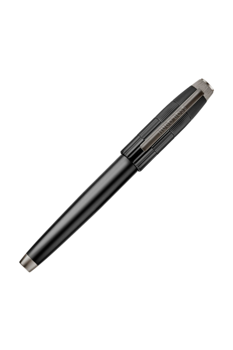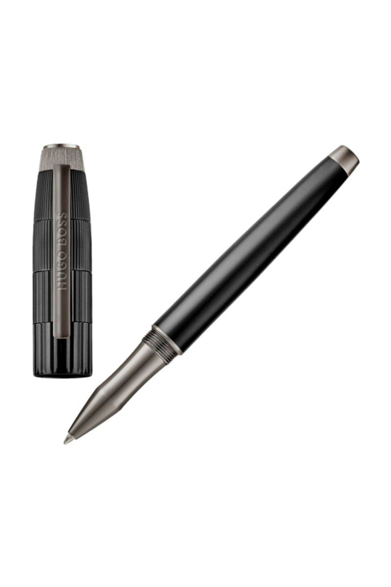 The Striato pen line celebrates the graphical play on stripes that defines the collection, interpreted here in its most luxurious expression. Its generous, sculptural silhouette is crowned with an oversized cap wrapped in a pattern of progressively tightening pinstripes, creating a sense of movement and visual precision. The result is a resolutely luxurious writing instrument with a distinctive graphical twist, where refined pattern work meets timeless elegance. This roller pen in black with gunmetal detailings is a true expression of contemporary luxury.