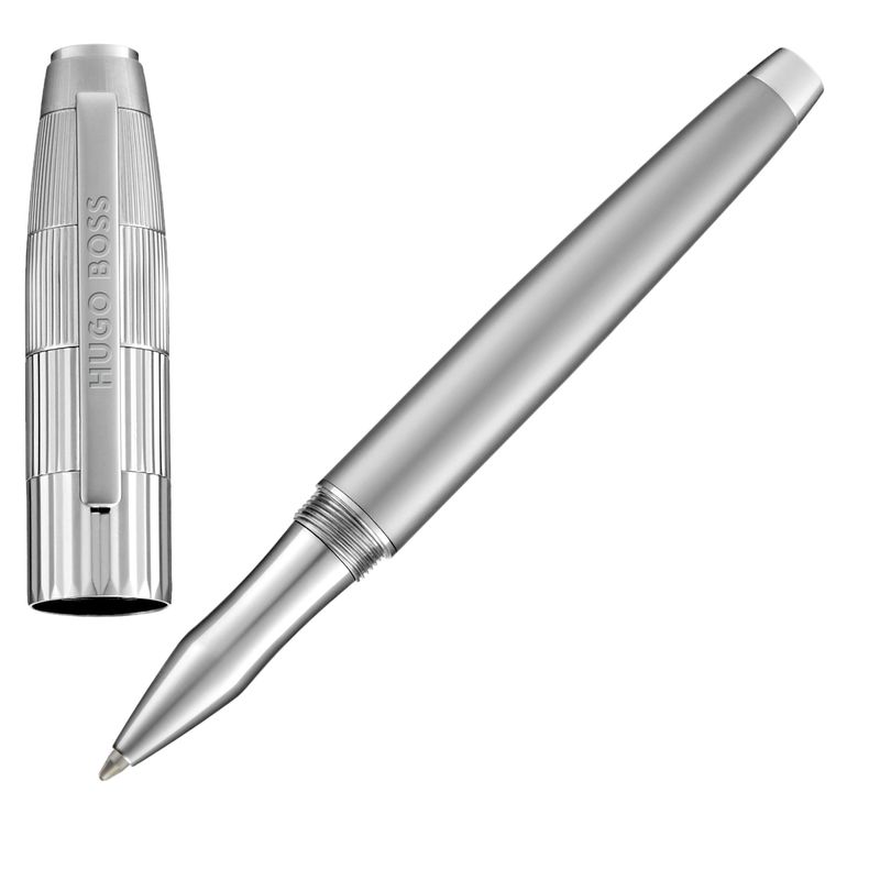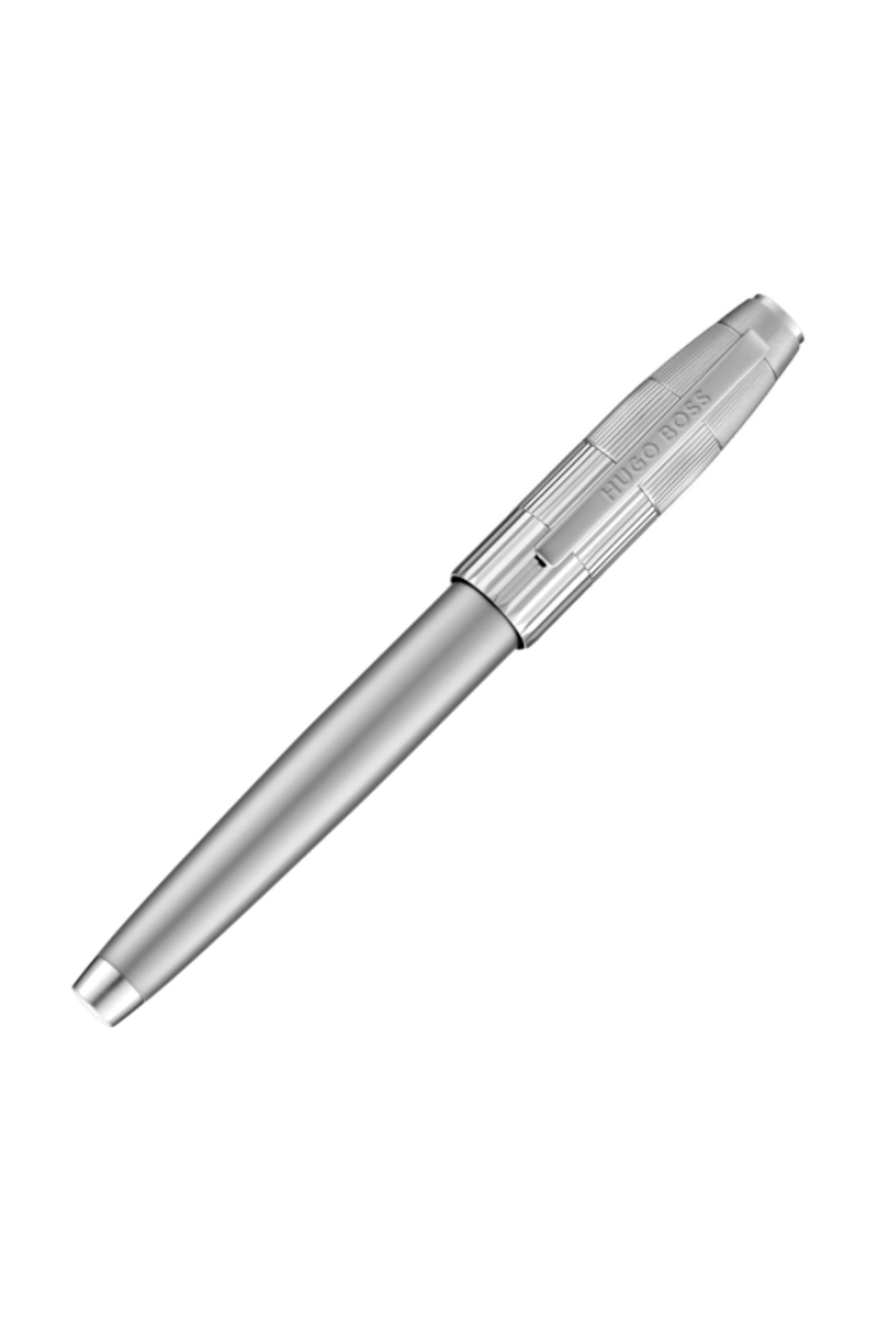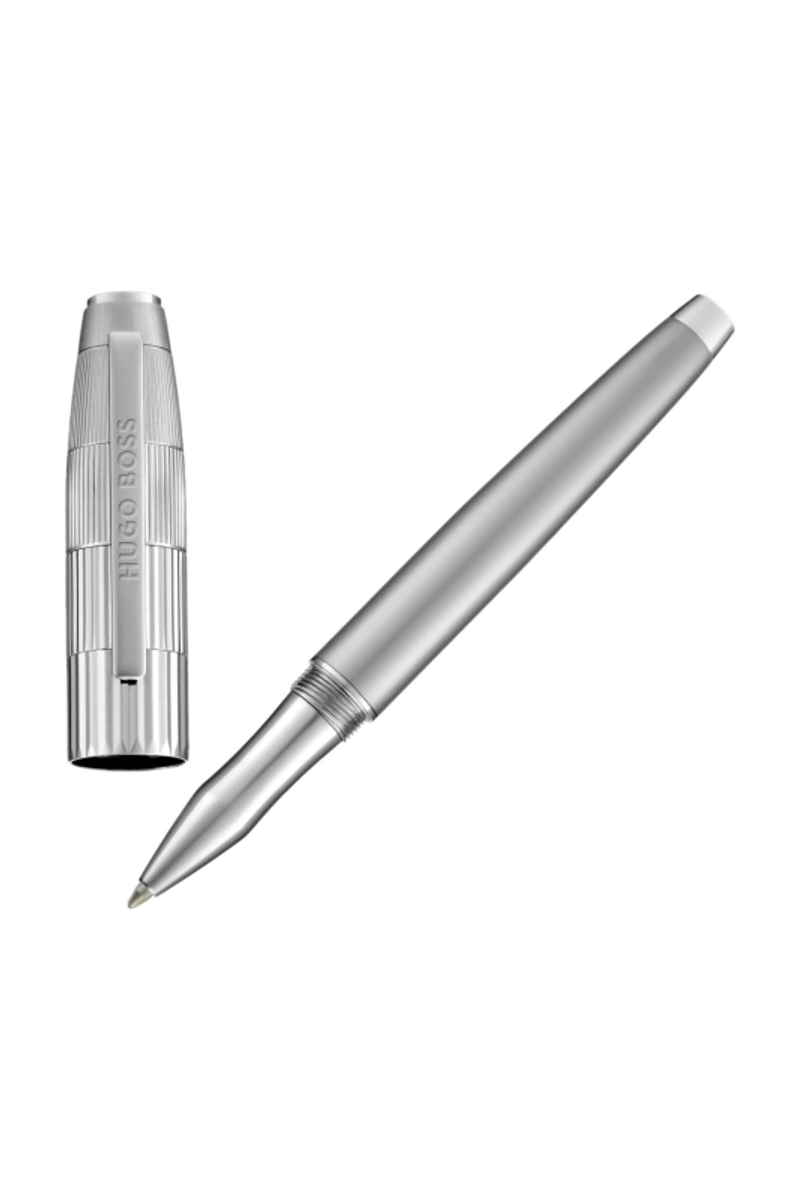 The Striato pen line celebrates the graphical play on stripes that defines the collection, interpreted here in its most luxurious expression. Its generous, sculptural silhouette is crowned with an oversized cap wrapped in a pattern of progressively tightening pinstripes, creating a sense of movement and visual precision. The result is a resolutely luxurious writing instrument with a distinctive graphical twist, where refined pattern work meets timeless elegance. This rollerball pen in all crisp chrome, with matt & shinny contrasts is a true expression of contemporary luxury, outfited with a large & signature HUGO BOSS nib.