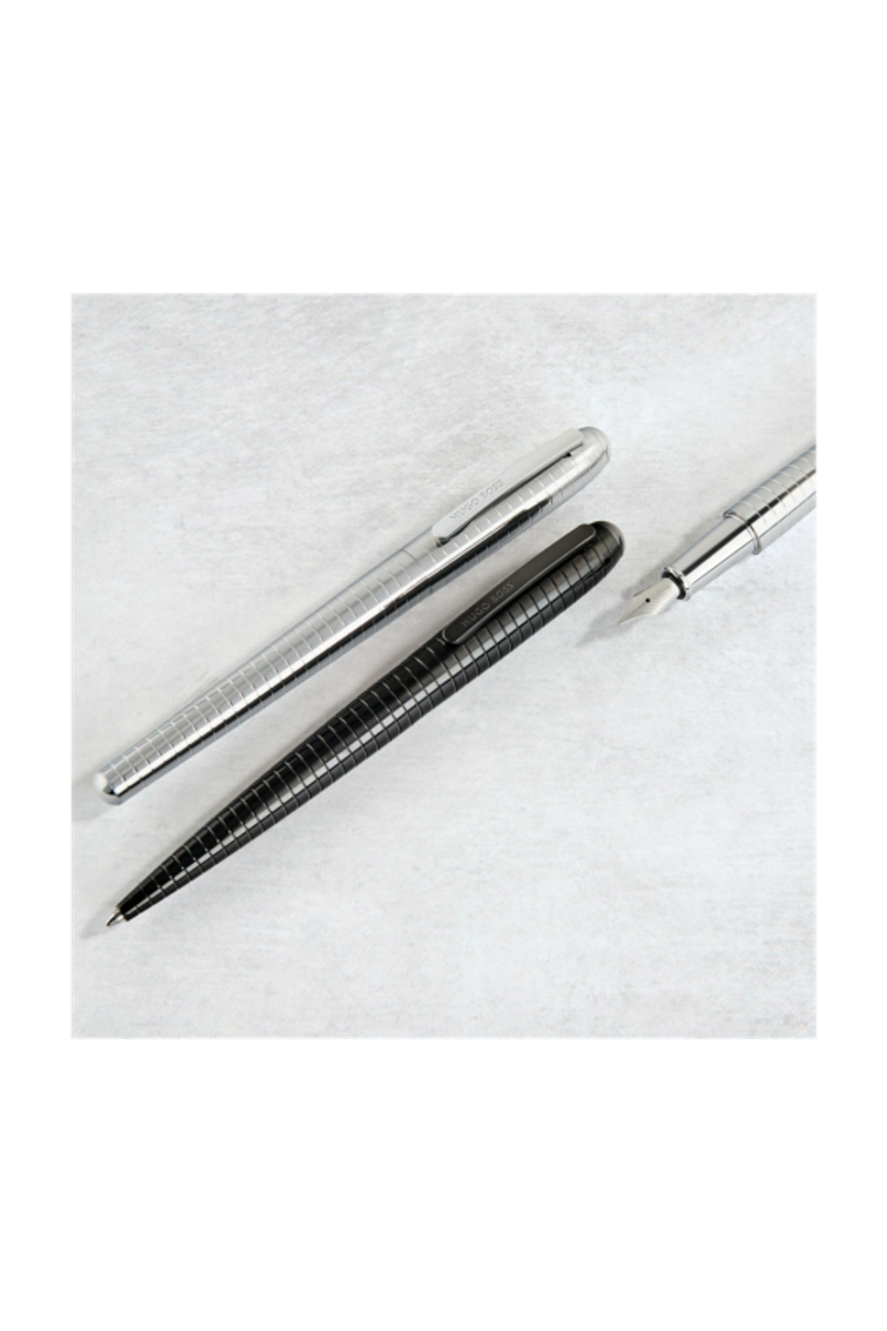 The Contour Bauhaus pen builds on the rounded, ogivoidal silhouette that has become a market favorite, with every line curved to create a fluid, seamless profile. Spaced horizontal lines bring an architectural, futuristic vibe, making the cap and barrel read as one continuous form. Plated in shiny finishes and signed with a HUGO BOSS logo on the clip, it comes in crisp chrome or deep, shiny black