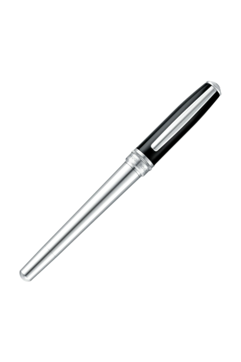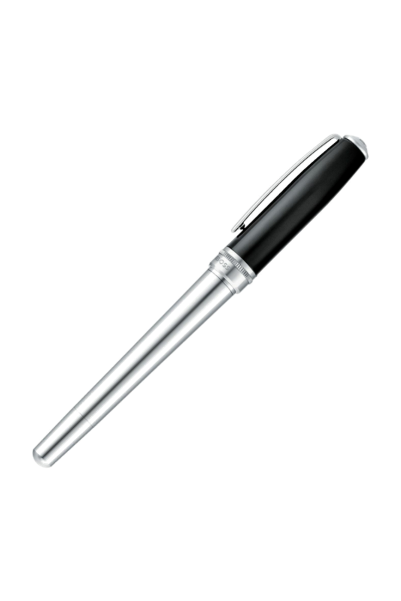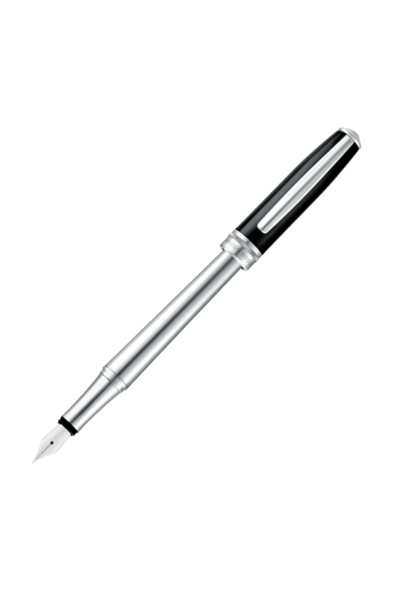 An all-time favorite, the Essential fountain pen revisits a signature silhouette through immaculate black lacquer and crisp shiny chrome plating. Luxurious metal accents enhance the purity of the design, while a subtle dented ring introduces a refined twist, echoing earlier BOSS writing collections. The new Double B logo completes this renewed yet already timeless writing instrument, designed for enduring appeal.