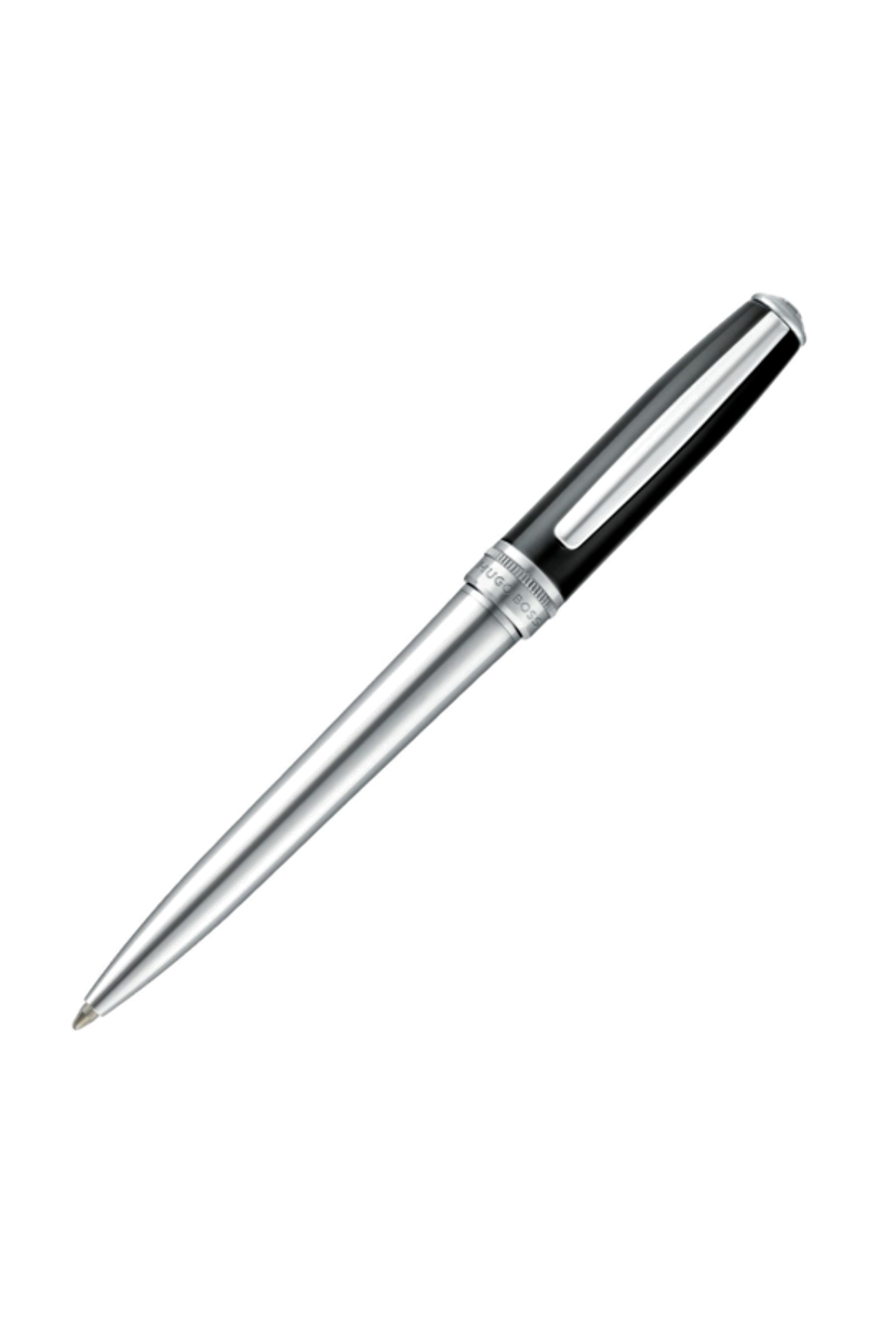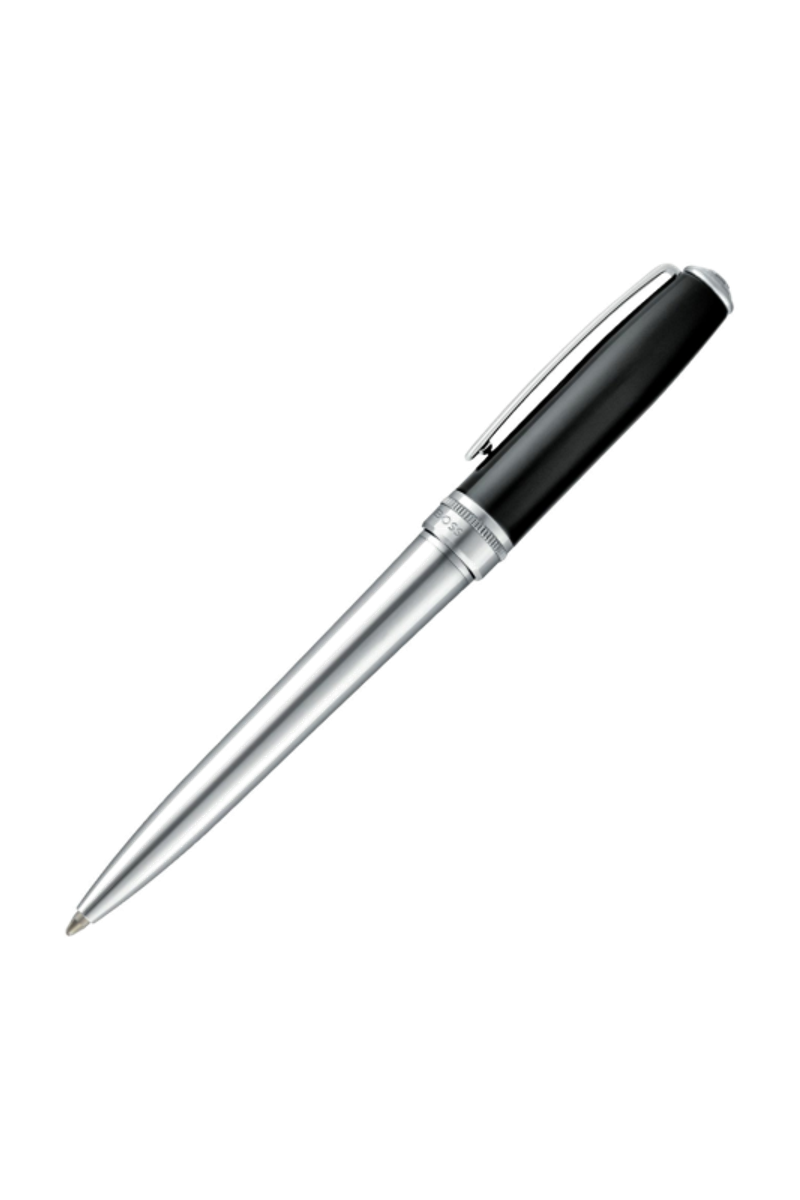 Reinterpreting an iconic design, the Essential ballpoint pen features crisp black lacquer paired with luminous chrome plating. A subtle dented ring adds character and depth, referencing earlier BOSS writing collections, while the new Double B logo brings a modern signature to this enduring, versatile writing piece.