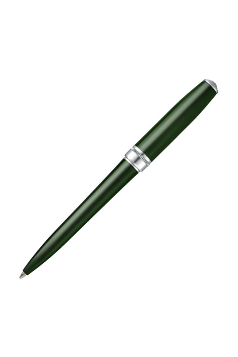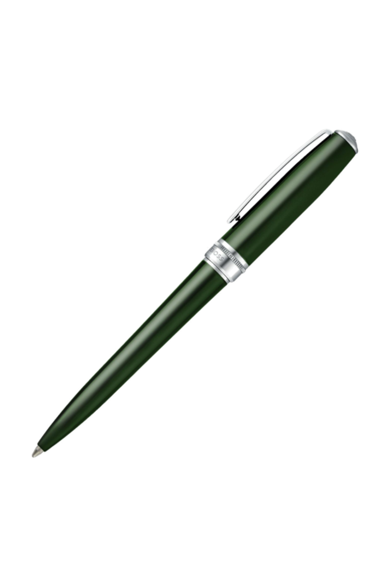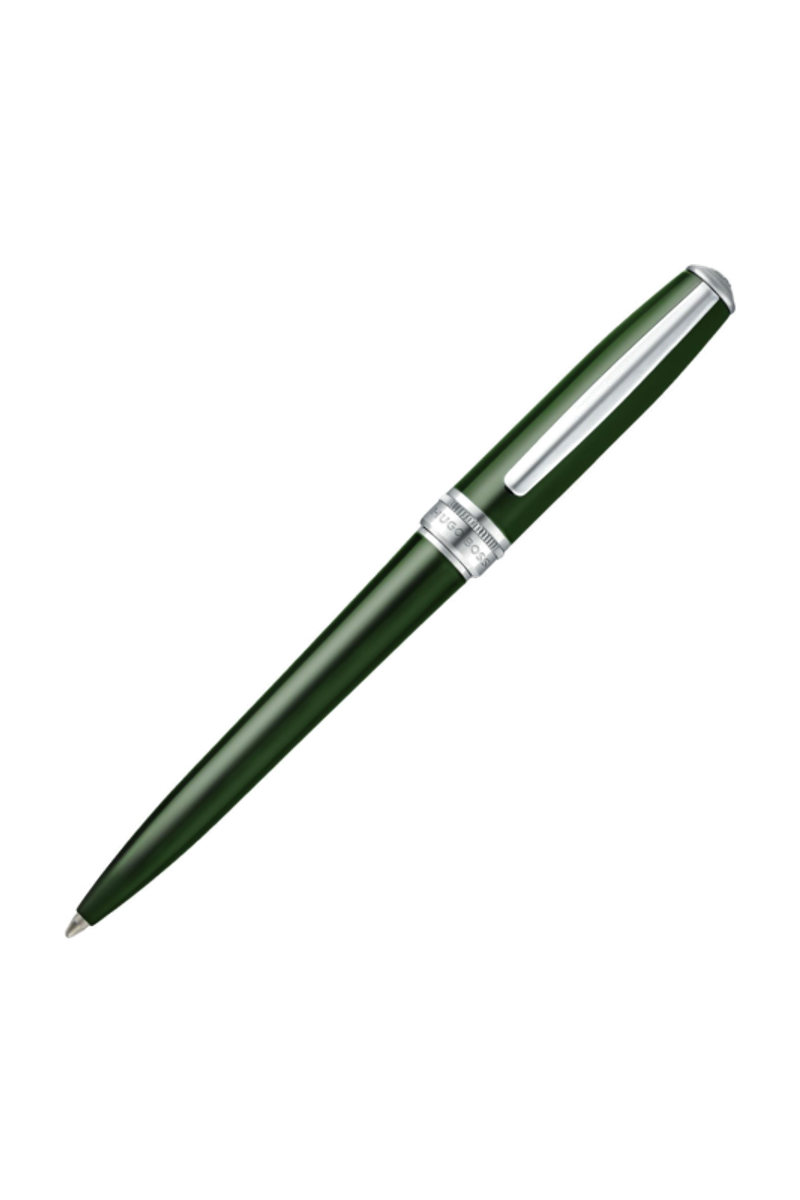 Rendered in a deep, elegant green lacquer, this Essential ballpoint pen brings a distinctive yet timeless tone to the collection. Chrome trims provide a clean contrast, while the signature dented ring adds a refined detail inspired by earlier BOSS writing designs. The new Double B logo completes this polished and enduring writing instrument.