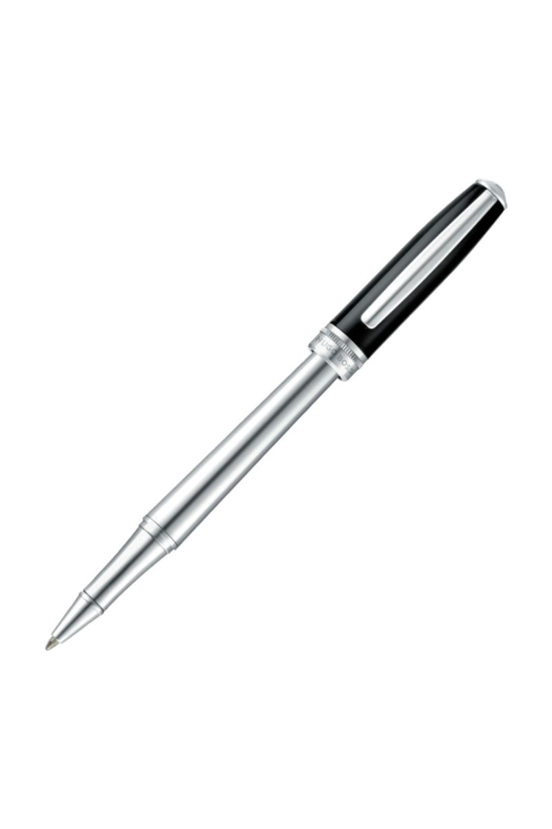 The Essential rollerball pen embodies timeless elegance through a perfectly balanced silhouette finished in glossy black lacquer and shiny chrome plating. Refined metal details and a delicately dented ring recall the heritage of past BOSS writing designs, while the new Double B logo discreetly signs this contemporary classic, crafted to remain constantly in demand.