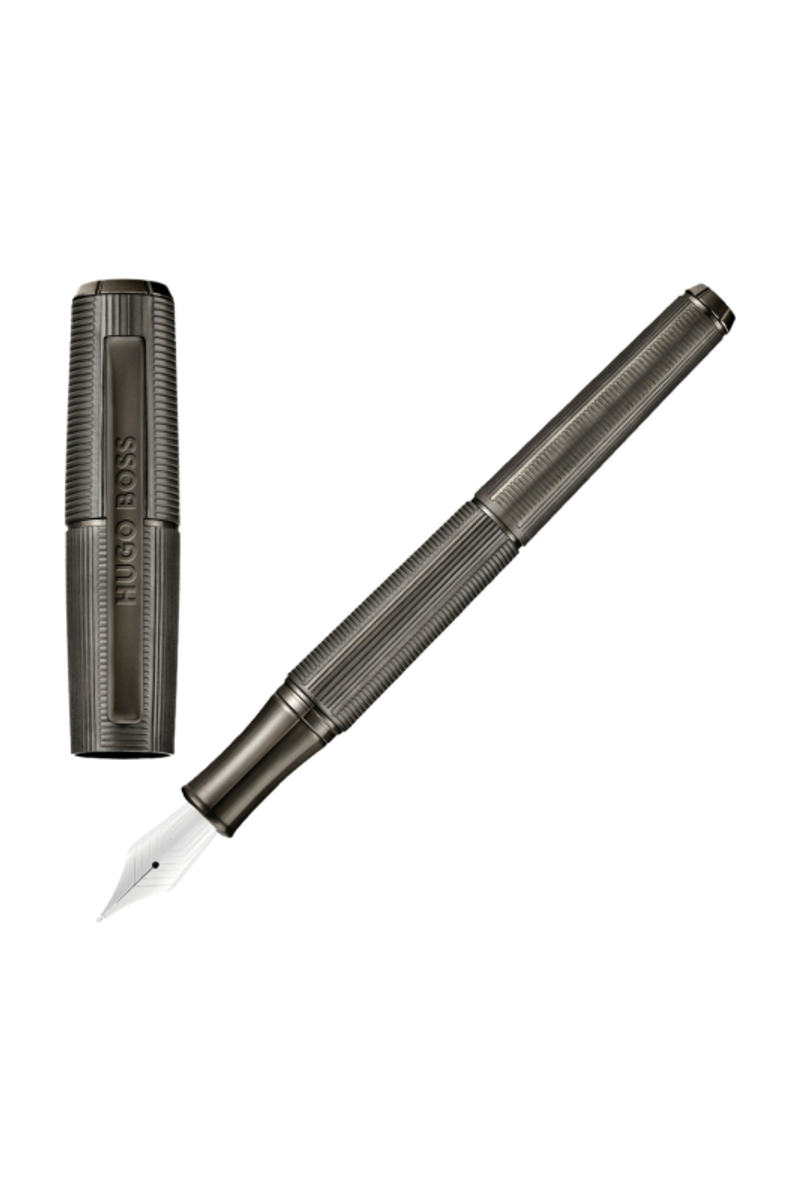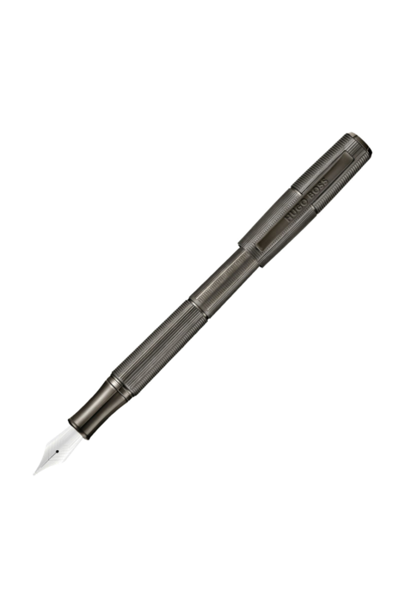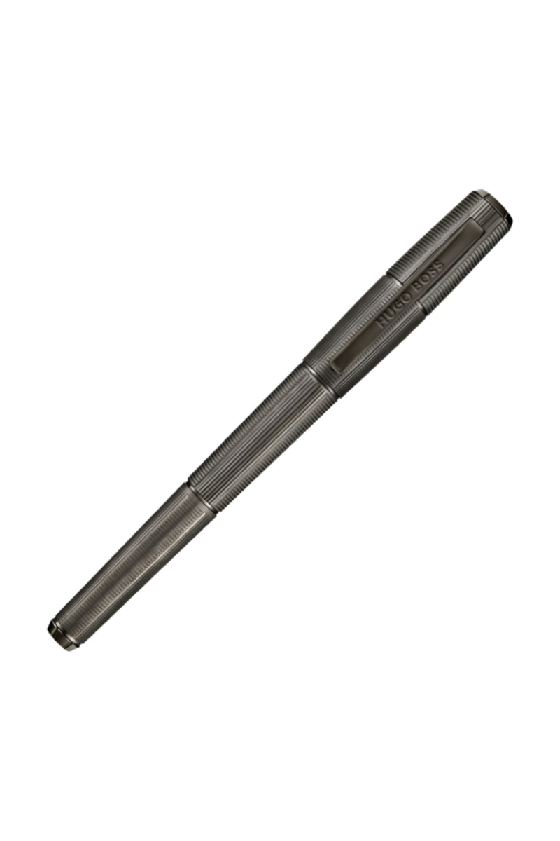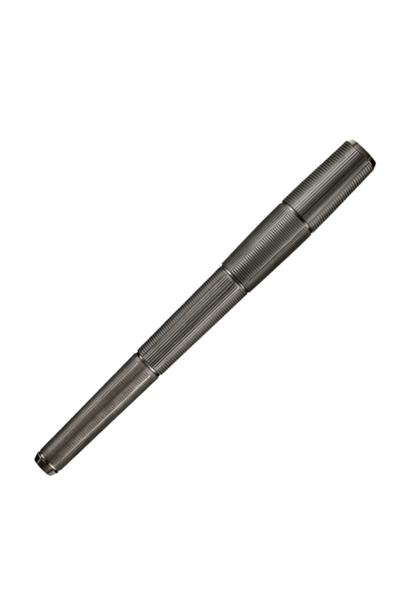 The Meridien pen reveals a futuristic, angular silhouette defined by a precise sequence of vertical and horizontal deep-engraved stripes. This graphic interplay forms a modern interpretation of the timeless herringbone pattern, giving the pen a sense of movement and structure. The minimal matte gunmetal plating reinforces its clean geometry, resulting in a piece that feels confidently modern and distinctly architectural.