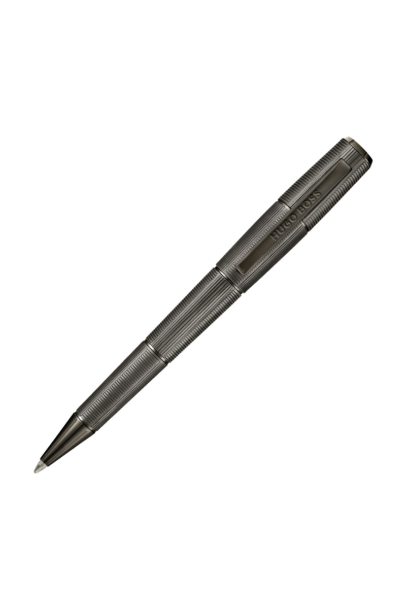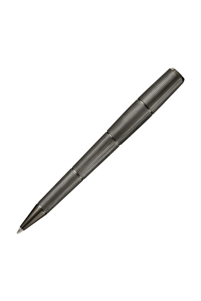 The Meridien pen reveals a futuristic, angular silhouette defined by a precise sequence of vertical and horizontal deep-engraved stripes. This graphic interplay forms a modern interpretation of the timeless herringbone pattern, giving the pen a sense of movement and structure. The minimal matte gunmetal plating reinforces its clean geometry, resulting in a piece that feels confidently modern and distinctly architectural.