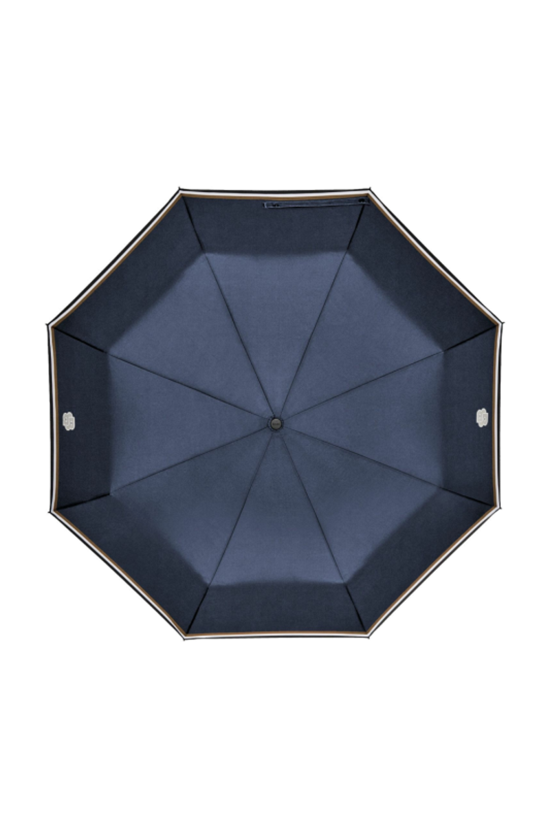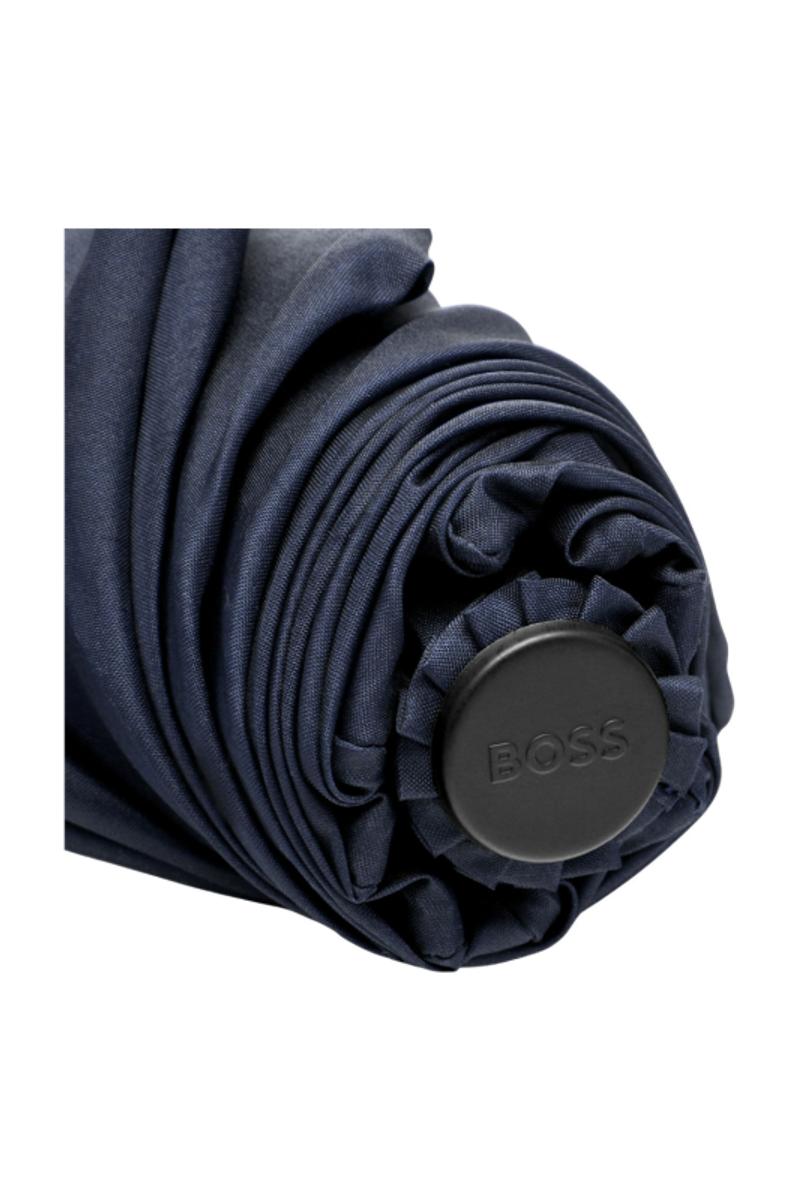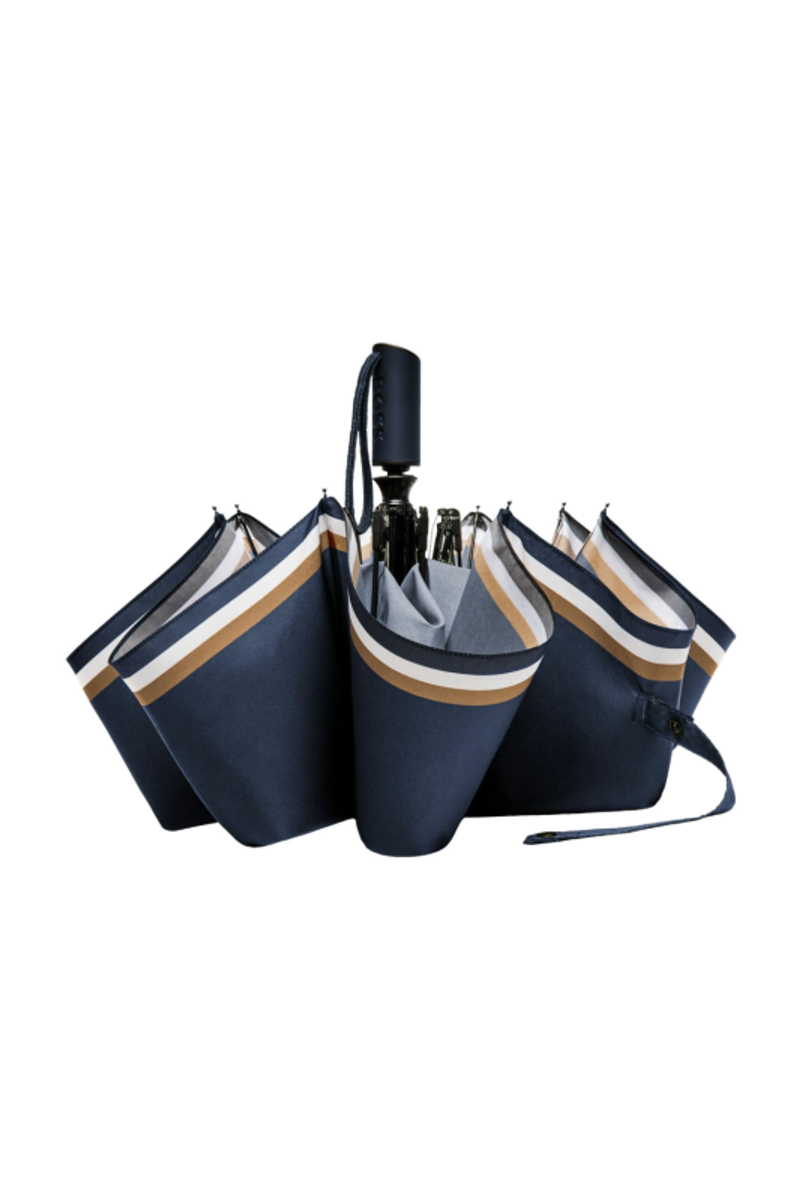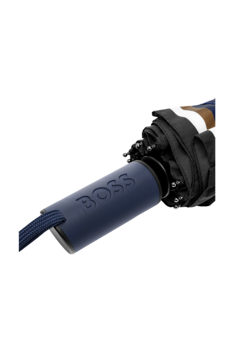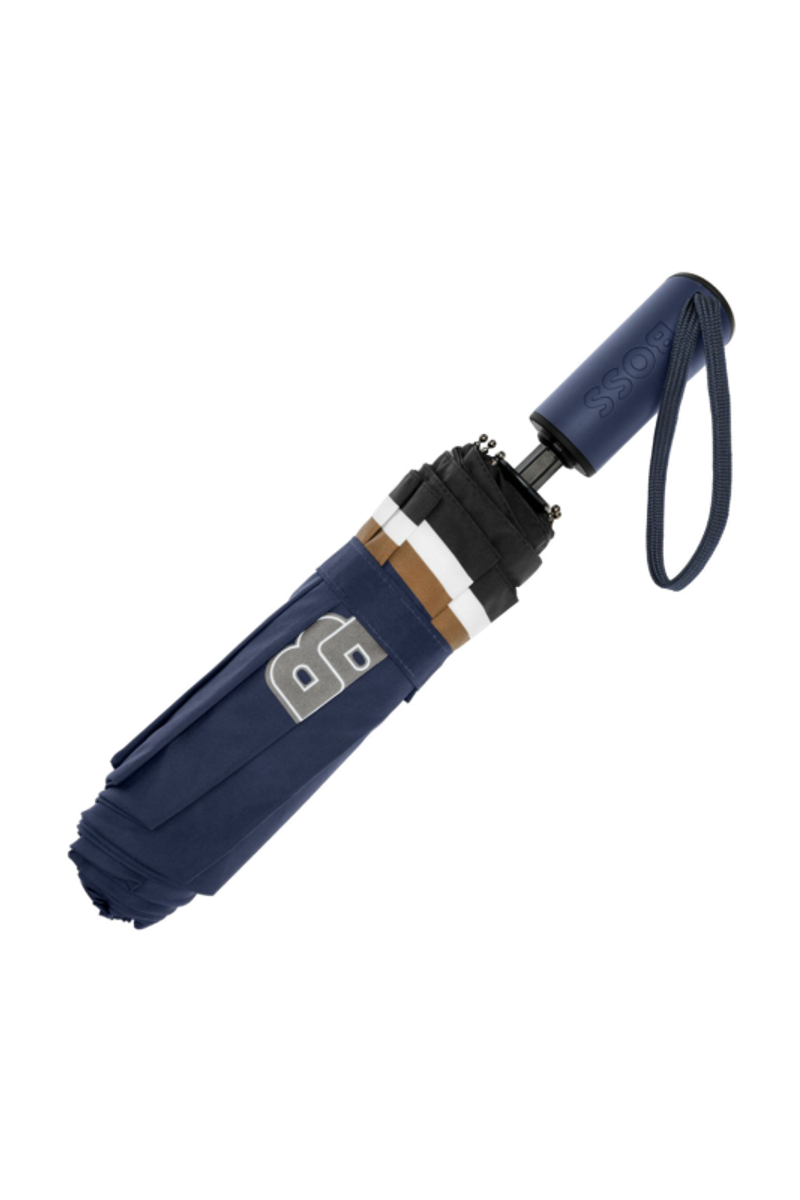 The Varsity umbrella channels a colorful, youthful energy with its bold, varsity-inspired graphical take on the Double B. The canopy is finished with the signature three-color stripe along the edge, adding a crisp nod to the brand’s codes. Offered in a compact pocket format, it comes in black, blue, forest green, and burgundy, each featuring a tonal handle luxuriously finished with the BOSS logo embossed.
