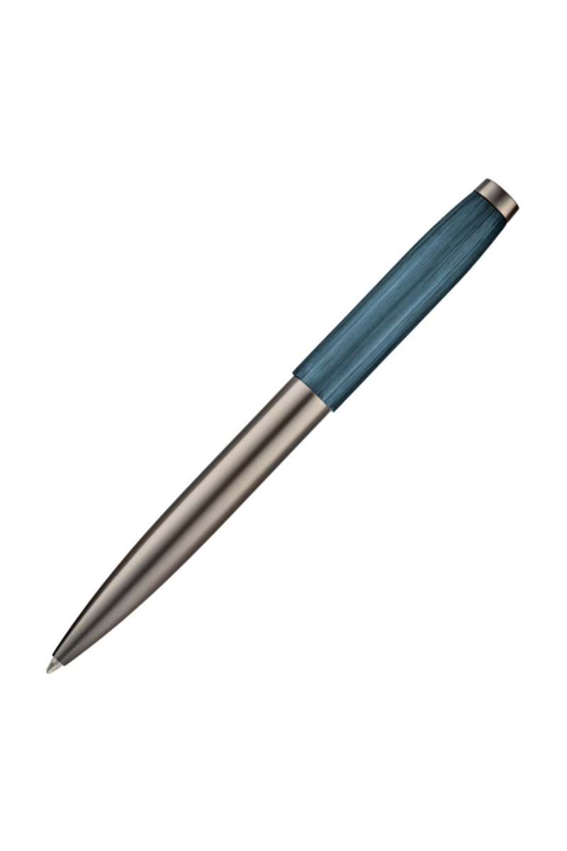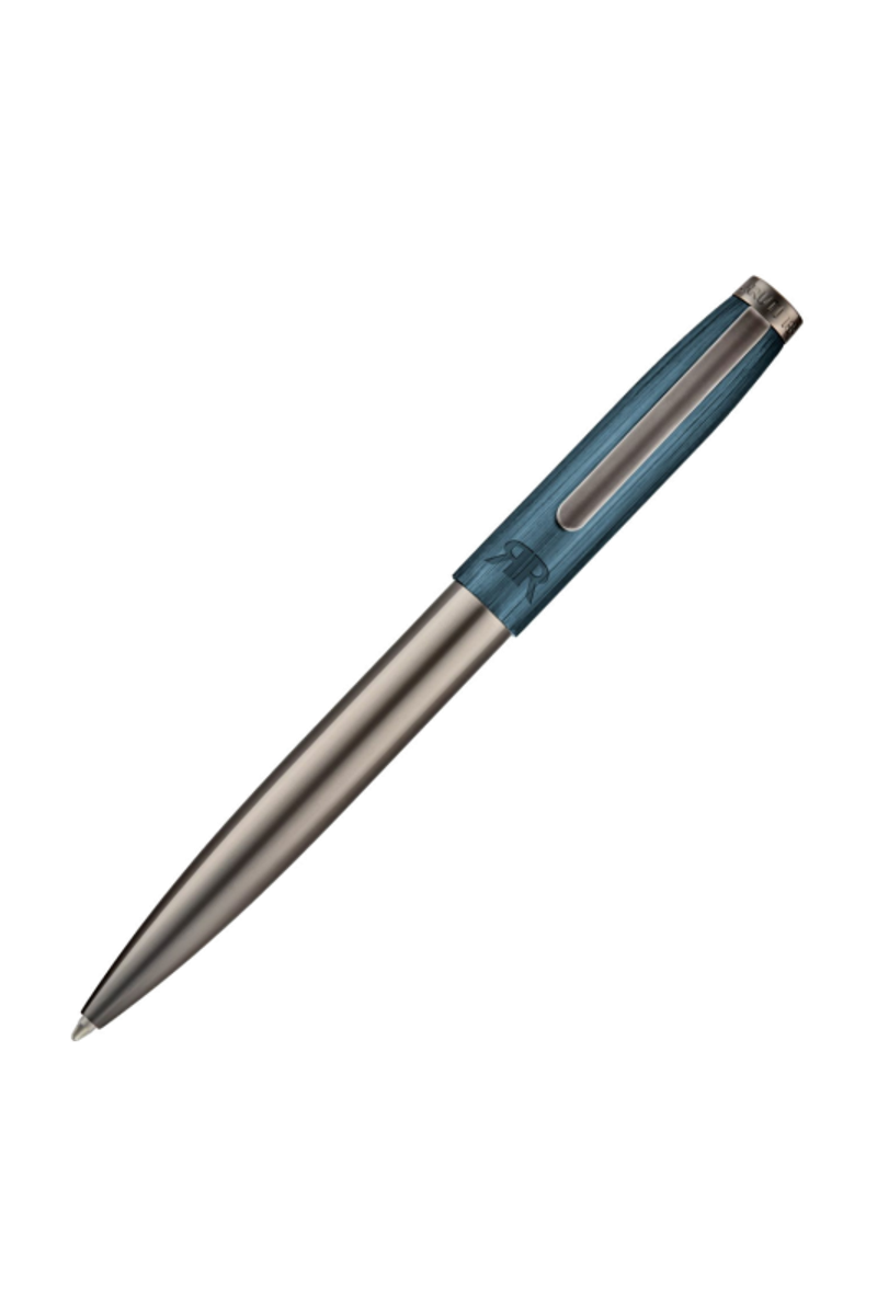 The Cerruti 1881 pen in navy and gun, in its ballpoint version, features a brushed cap engraved with the RR logo of the new branding, contrasted by a smooth, luxuriously plated lower barrel in gunmetal. The rich navy tone paired with the darker metallic finish creates a refined, contemporary contrast, offering a sophisticated and distinctive everyday writing piece.