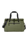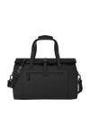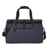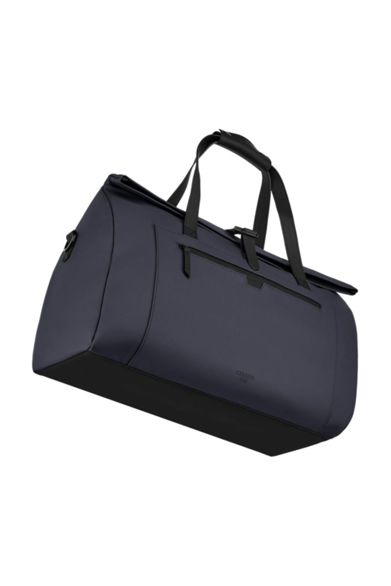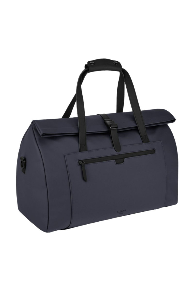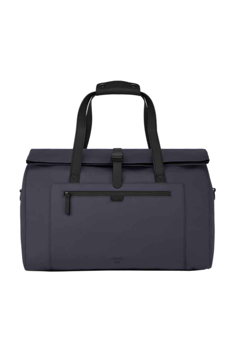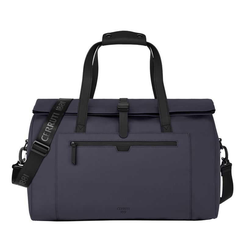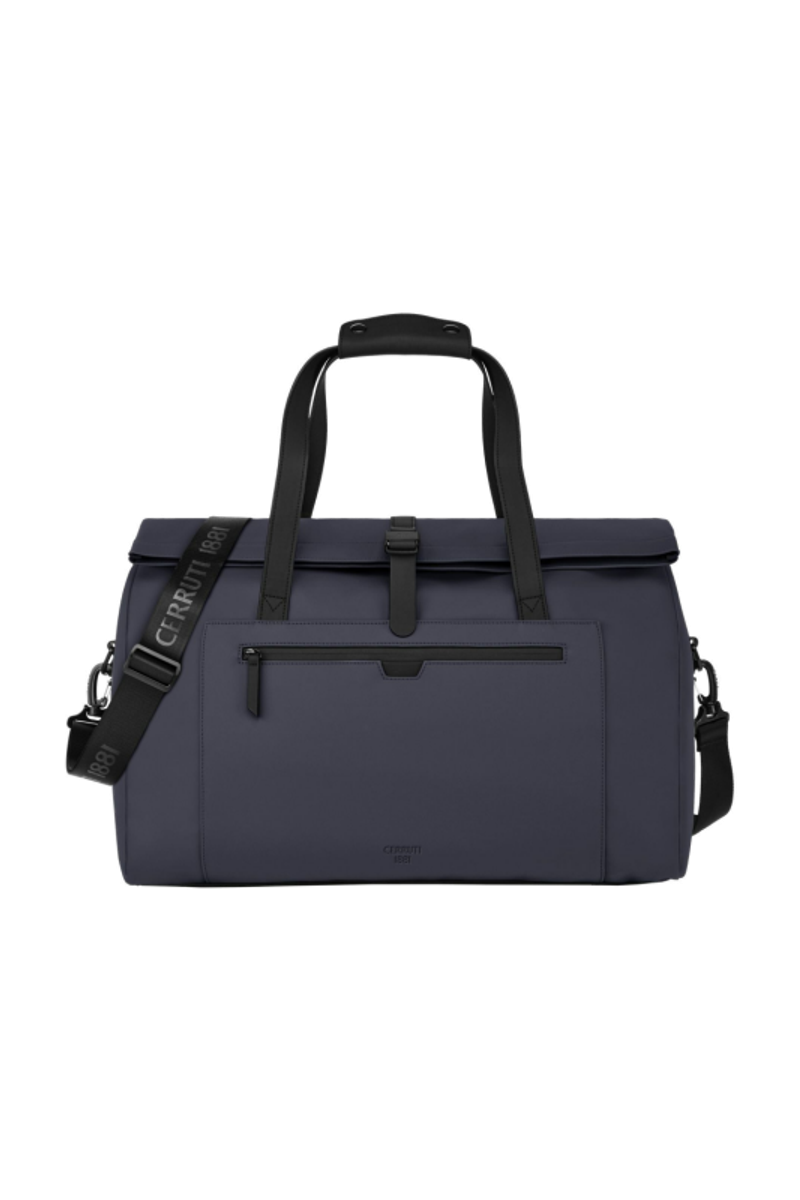 Designed with form as much as function in mind, this casual-inspired weekend bag is rendered in a deep navy tone, elevated by elegant black matte details. A subtle utilitarian aesthetic is expressed through its rolled-top closing construction, perfectly finished with an integrated magnetic closure engraved with the RR signature. The silhouette is light and roamy, created for effortless movement and everyday escape. A flat pocket to the front ensures easy access, while the detachable webbing strap allows adaptable carry. Inside, a spacious roamy interior reveals a refined monogram lining, finished with a zipped inner pocket for secure organization. It is the perfect accessory for someone with a minimalist yet casual and modern aesthetic.