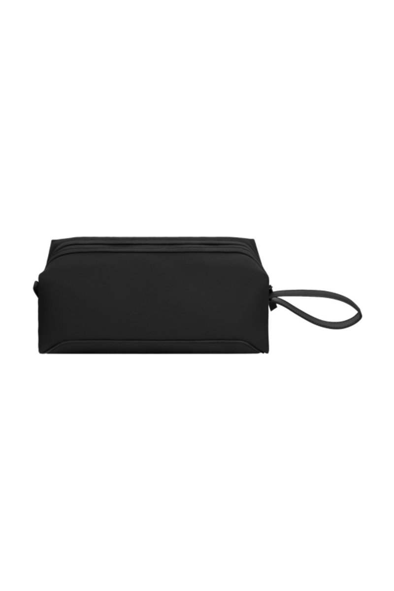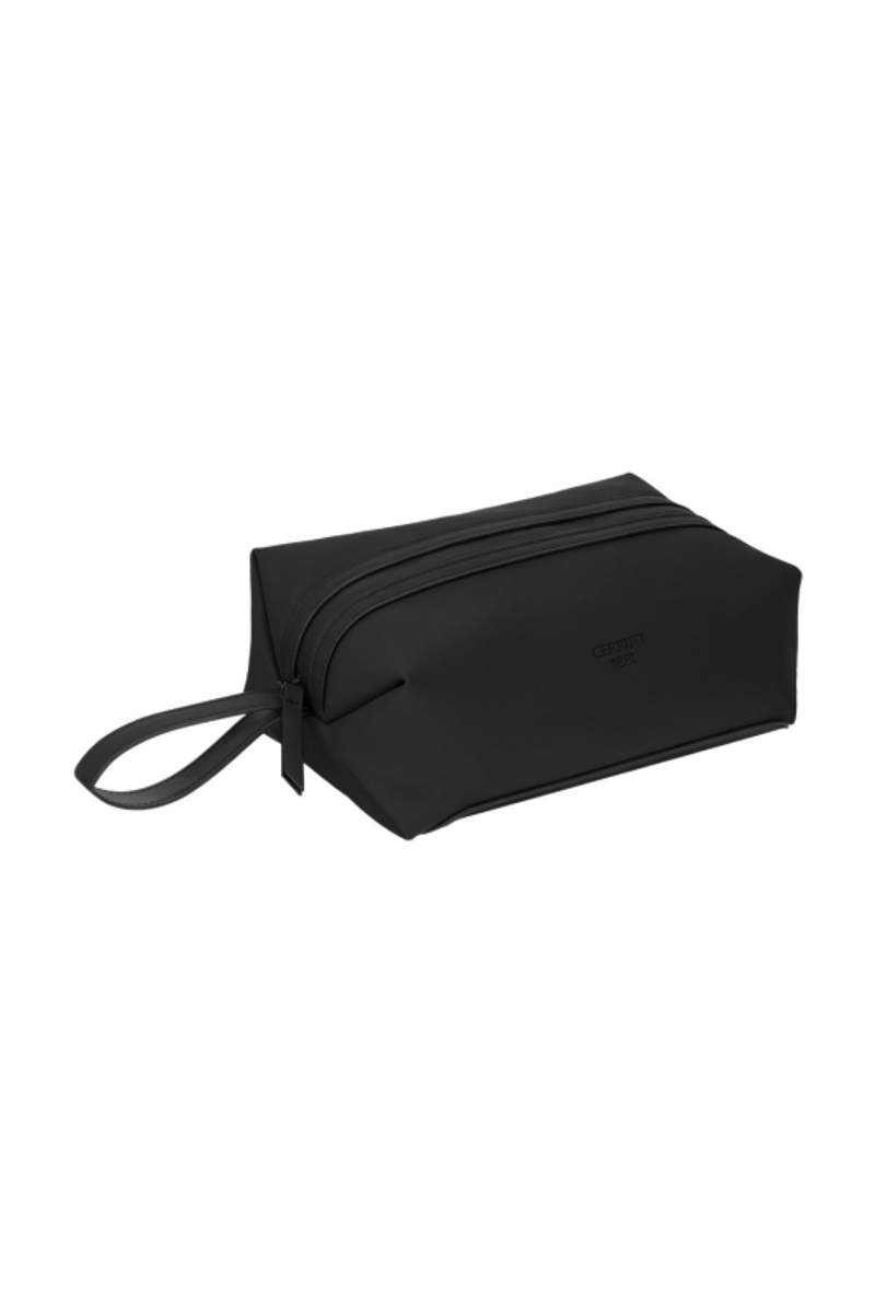 Crafted with a very modern shape that has become one of Cerruti’s signature design codes, the Easton cosmetic bag in black is elevated by refined black matte trims. Minimally signed with an embossed Cerruti 1881 logo, it embodies a clean and contemporary attitude. The interior is discreetly monogramed, offering a subtle nod to the house’s identity. A practical wristlet adds ease of use, making it an ideal piece for movement. The ultimate minimalistic and practical travel companion to organise all essentials.