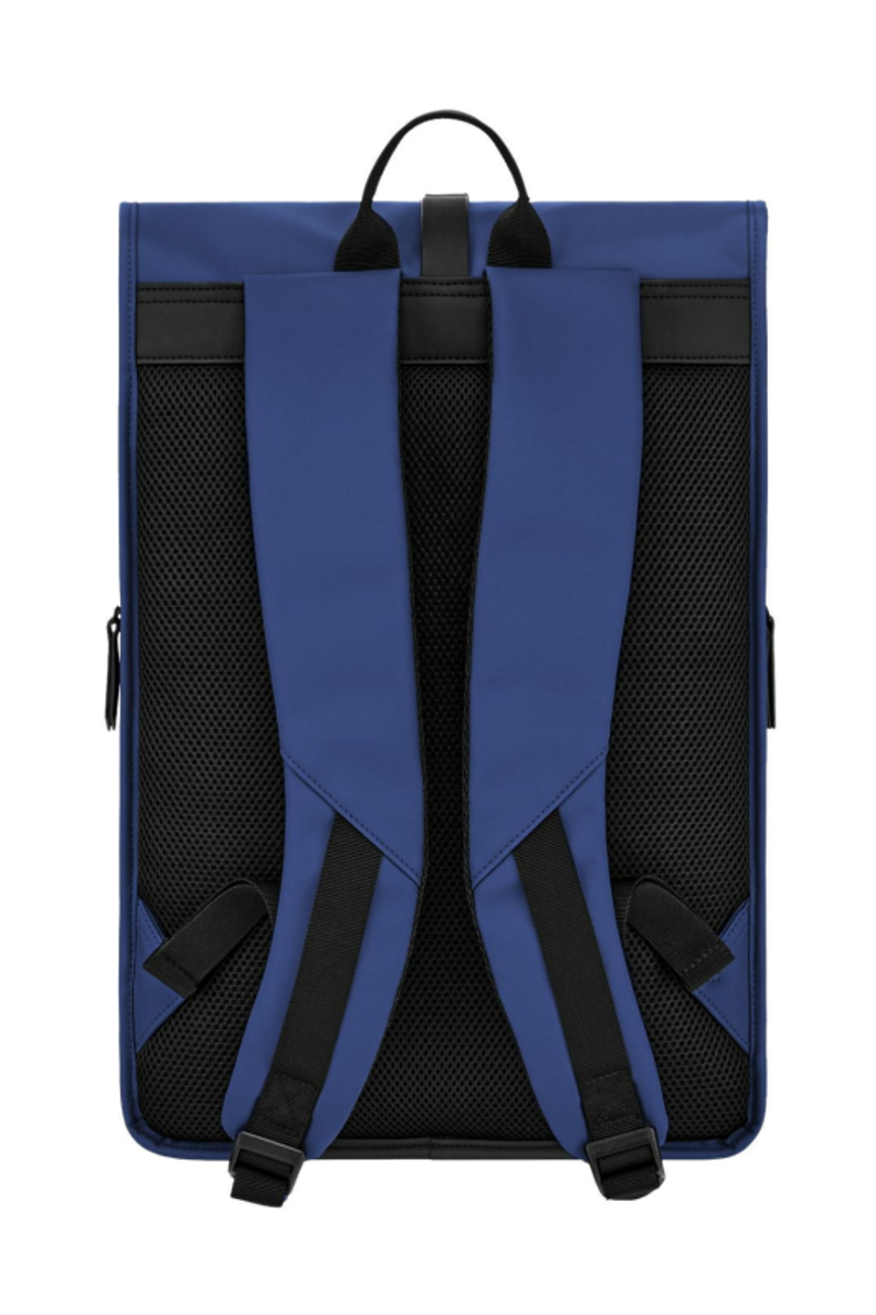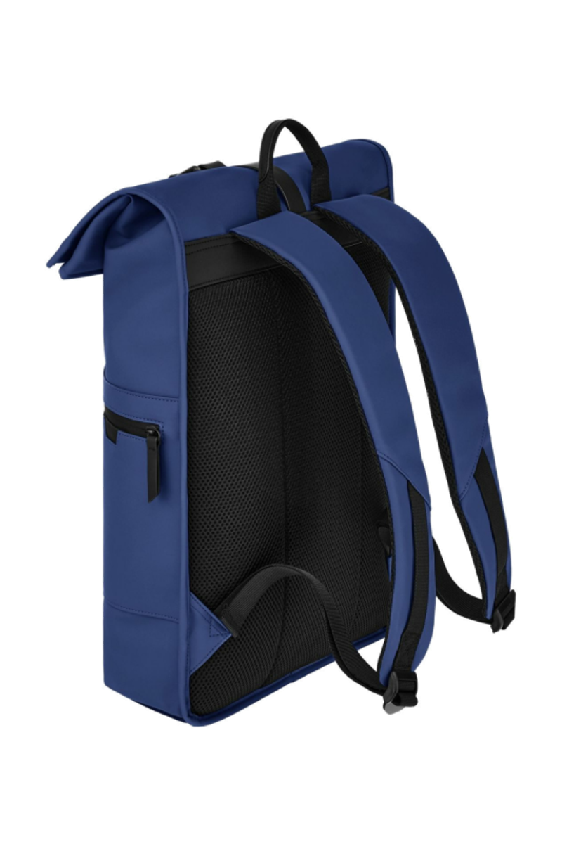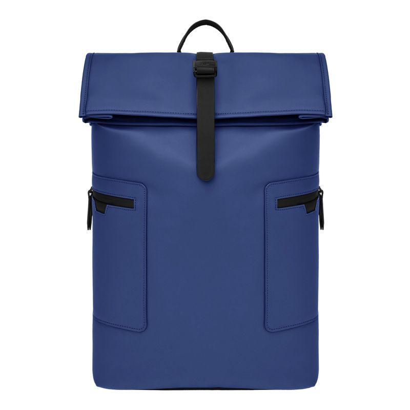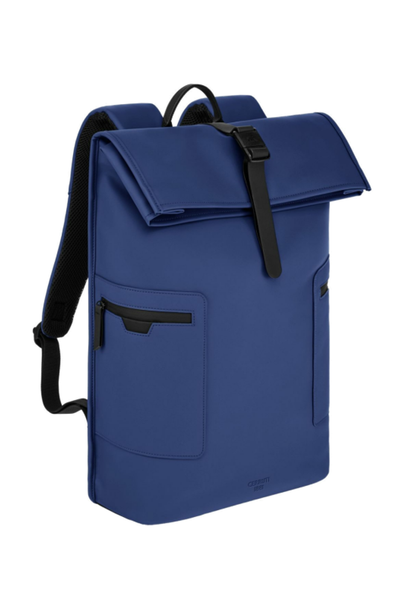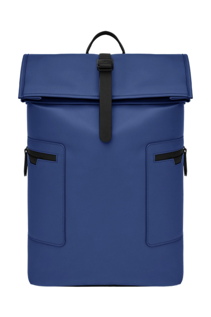 Designed with form as much as function in mind, this casual-inspired rolled-top backpack is offered in a vibrant bright blue for a trend-forward expression, elevated by elegant black matte details. A subtle utilitarian aesthetic is expressed through its rolled-top closing construction, perfectly finished with an integrated magnetic closure engraved with the RR signature. The silhouette is light and roamy, ideal for daily movement. Two flat zipped pockets to the front provide practical organization, while the interior features a dedicated laptop compartment for everyday essentials. A padded back panel and padded shoulder straps ensure lasting comfort in use. Inside, a spacious roamy interior reveals a refined monogram lining, completed with a zipped inner pocket for secure storage. It is the perfect accessory for someone with a minimalist yet casual and modern aesthetic.