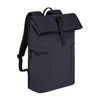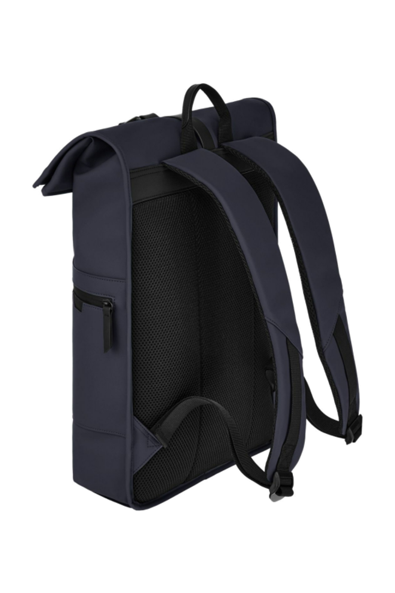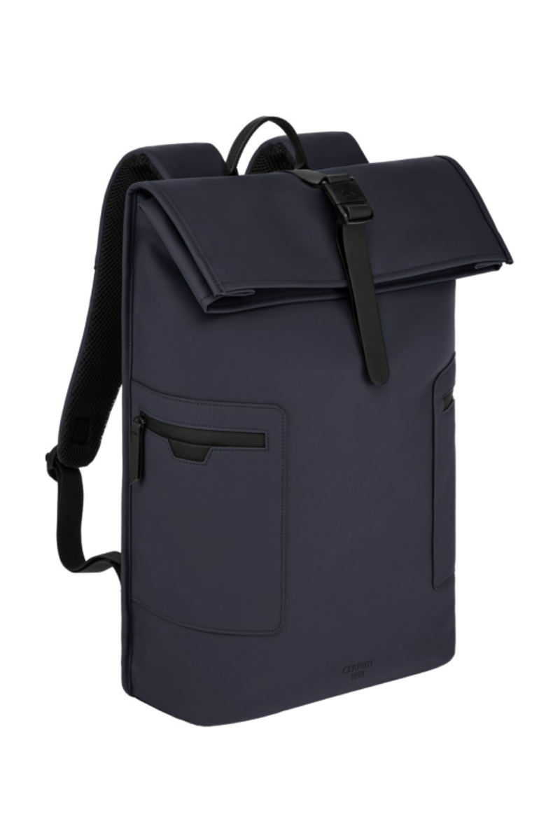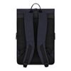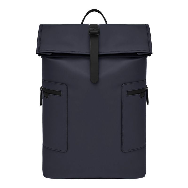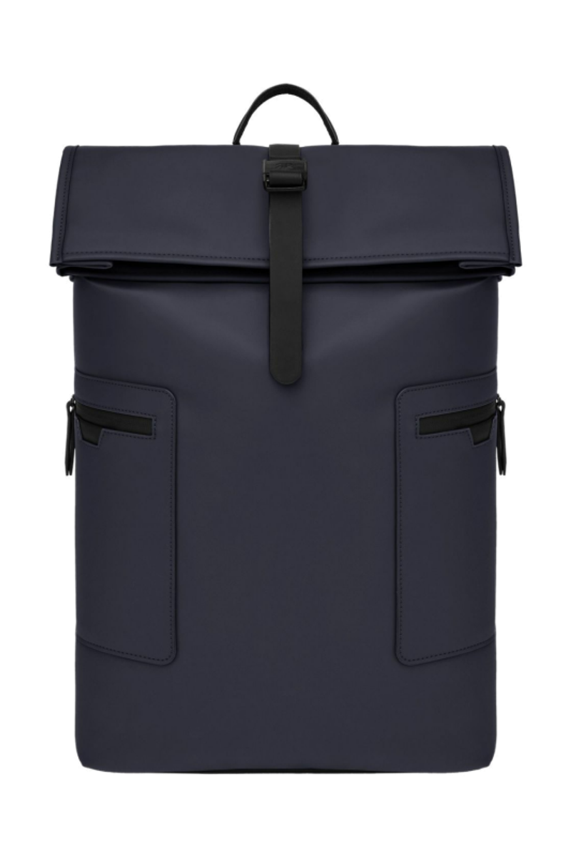 Designed with form as much as function in mind, this casual-inspired rolled-top backpack is rendered in a deep navy tone, elevated by elegant black matte details. A subtle utilitarian aesthetic is expressed through its rolled-top closing construction, perfectly finished with an integrated magnetic closure engraved with the RR signature. The silhouette is light and roamy, ideal for daily movement. Two flat zipped pockets to the front provide practical organization, while the interior features a dedicated laptop compartment for everyday essentials. A padded back panel and padded shoulder straps ensure lasting comfort in use. Inside, a spacious roamy interior reveals a refined monogram lining, completed with a zipped inner pocket for secure storage. It is the perfect accessory for someone with a minimalist yet casual and modern aesthetic.
