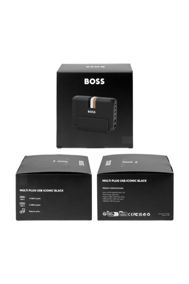 Questa presa multipla da scrivania combina un design pulito e funzionale con l'inconfondibile firma BOSS. Rifinita in nero opaco, è caratterizzata da un iconico dettaglio grafico che aggiunge un tocco raffinato e contemporaneo. Progettata per l'efficienza quotidiana, è dotata di un totale di sei porte di ricarica, di cui quattro USB-C e due USB-A, che consentono di alimentare contemporaneamente più dispositivi da un unico punto. Compatto e stabile, è fatto per stare comodamente su una scrivania, offrendo una soluzione pratica e snella per gli spazi di lavoro moderni.