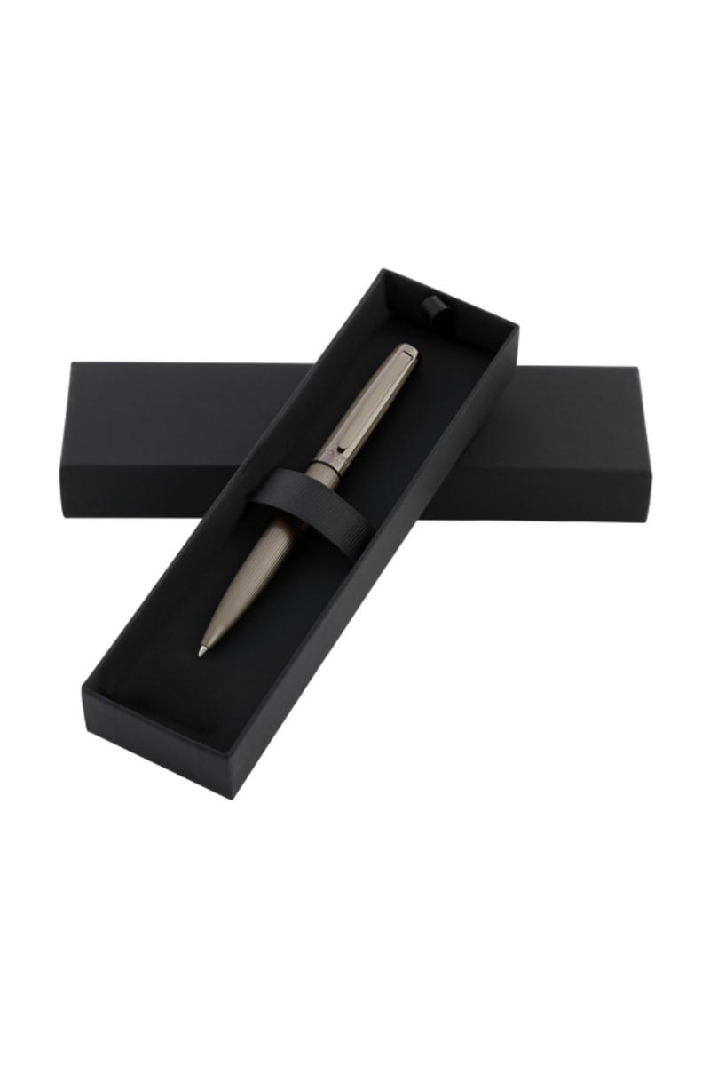 The Cerruti 1881 gunmetal ballpoint pen embodies luxurious minimalism through a smooth cap engraved with the new two-row Cerruti 1881 logo, contrasted by a pinstripe-engraved lower barrel. Its deep, elegant gunmetal finish brings depth and modern sophistication to a clean, architectural silhouette.