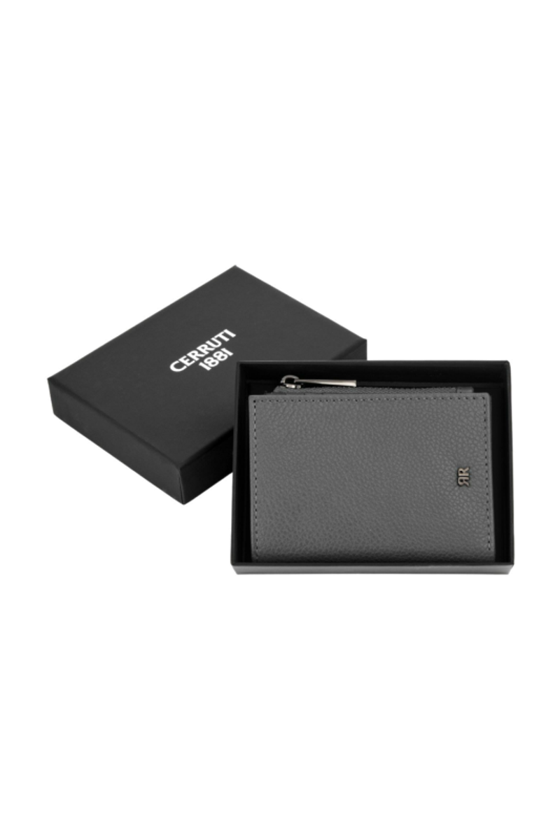 The CERRUTI 1881 Jefferson zipped card holder is compact and highly functional, offering six card slots, two vertical compartments, a main note compartment, and a zipped pocket housed in an impressively compact volume. Crafted in carefully selected grained, best-quality leather, it delivers durability and a refined tactile feel. The metal accents elevate the design: the 1881 zipper puller serves as a luxurious detail, while the miniature double signature in gunmetal blends seamlessly with the tonal grey leather, creating an understated, minimal, and quietly luxurious expression.