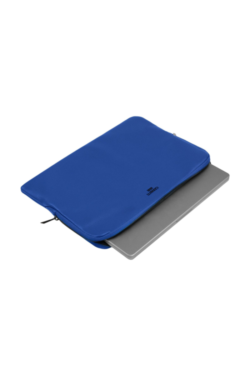 The Jefferson computer pouch in bright blue with matte black trims delivers a fashion-forward attitude while remaining an essential, functional everyday accessory. Compact and protective, it is crafted from a carefully selected matte-grained texture that brings a contemporary vibrancy to the minimal silhouette. Matte black metal accents—including the new Cerruti 1881 plate and angular signature zipper pullers engraved with RR—create a striking contrast and a distinctive finishing detail. With its monogramed lining and beautifully executed simplicity, the piece stands as a bold yet timeless companion.