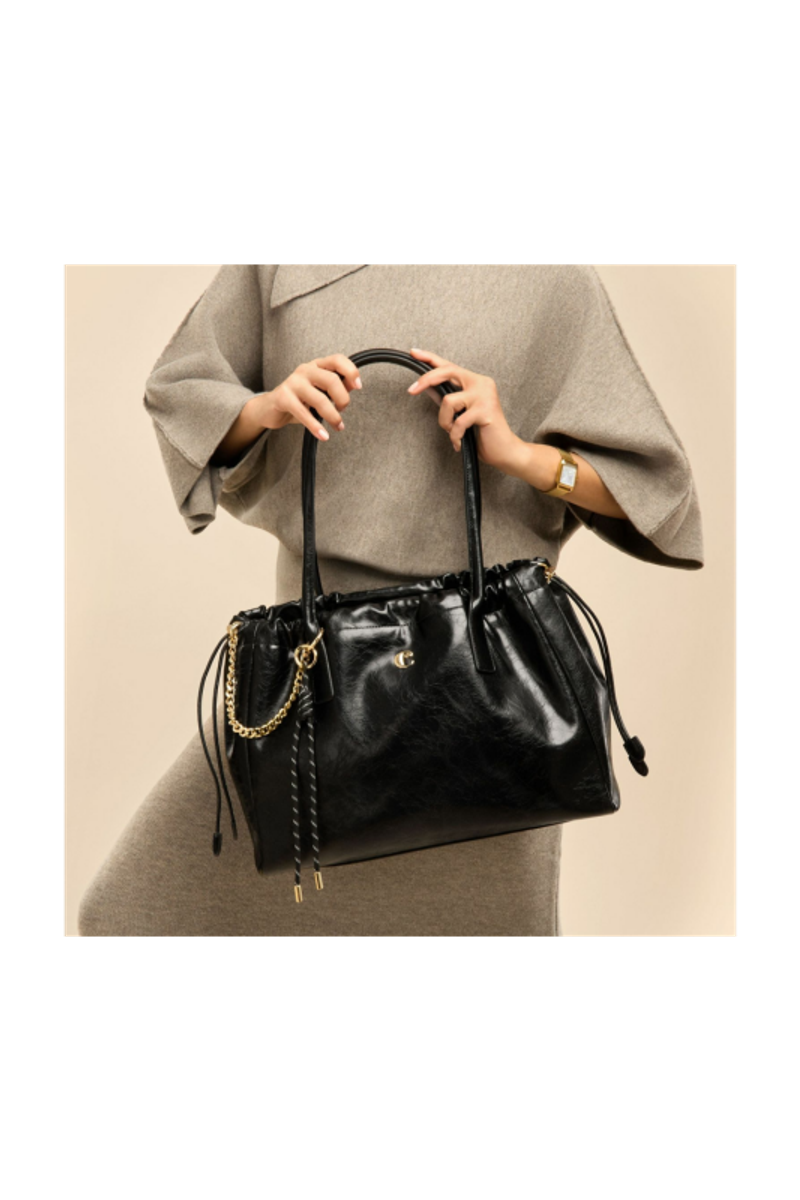 Le fourre-tout Philomène incarne une sophistication raffinée avec une touche d'assurance et d'avant-garde. Réalisé dans un cuir glacé et froissé, il est signé de la plaque C de Cacharel, rehaussé d'élégantes bordures dorées et subtilement embossé du logo Cacharel. La matière est douce, souple et luxueuse. Conçu dans un format généreux, le fourre-tout offre un intérieur spacieux et bien structuré, idéal pour l'organisation quotidienne. Il est orné d'un cordon en PU autour de l'ouverture, qui lui confère une silhouette de pochette moderne, et d'une breloque décorative amovible composée d'un cordon tressé et d'une chaîne en acier inoxydable plaqué or, qui ajoute une touche de style distinctive. Le sac de travail chic et féminin par excellence, qui allie à la fois praticité et élégance. Disponible en noir