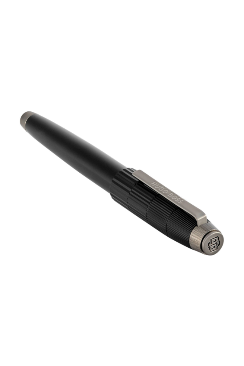 The Striato pen line celebrates the graphical play on stripes that defines the collection, interpreted here in its most luxurious expression. Its generous, sculptural silhouette is crowned with an oversized cap wrapped in a pattern of progressively tightening pinstripes, creating a sense of movement and visual precision. The result is a resolutely luxurious writing instrument with a distinctive graphical twist, where refined pattern work meets timeless elegance. This roller pen in black with gunmetal detailings is a true expression of contemporary luxury.