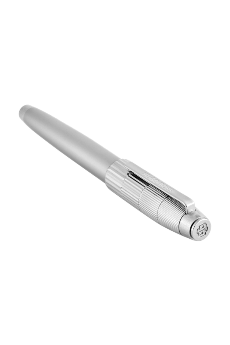 The Striato pen line celebrates the graphical play on stripes that defines the collection, interpreted here in its most luxurious expression. Its generous, sculptural silhouette is crowned with an oversized cap wrapped in a pattern of progressively tightening pinstripes, creating a sense of movement and visual precision. The result is a resolutely luxurious writing instrument with a distinctive graphical twist, where refined pattern work meets timeless elegance. This rollerball pen in all crisp chrome, with matt & shinny contrasts is a true expression of contemporary luxury, outfited with a large & signature HUGO BOSS nib.