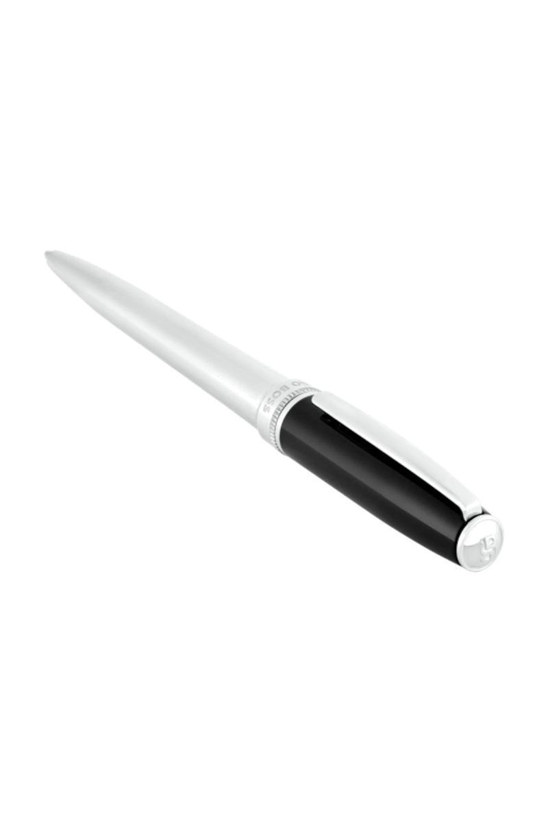 Reinterpreting an iconic design, the Essential ballpoint pen features crisp black lacquer paired with luminous chrome plating. A subtle dented ring adds character and depth, referencing earlier BOSS writing collections, while the new Double B logo brings a modern signature to this enduring, versatile writing piece.