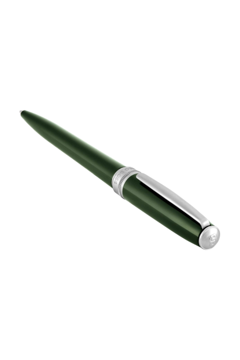 Rendered in a deep, elegant green lacquer, this Essential ballpoint pen brings a distinctive yet timeless tone to the collection. Chrome trims provide a clean contrast, while the signature dented ring adds a refined detail inspired by earlier BOSS writing designs. The new Double B logo completes this polished and enduring writing instrument.
