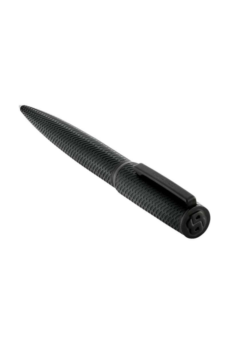 The Arche Pattern pen introduces a modern tapered silhouette, elevated by an innovative brushed-aluminum surface engraved with a pattern inspired by activewear mesh. Designed for a distinctly modern and innovative feel, it is finished with black trims and a Double B signature at the top, while the clip is adorned with the HUGO BOSS logo. Rendered entirely in black, it delivers a sleek, minimal expression with a sharp, contemporary attitude.