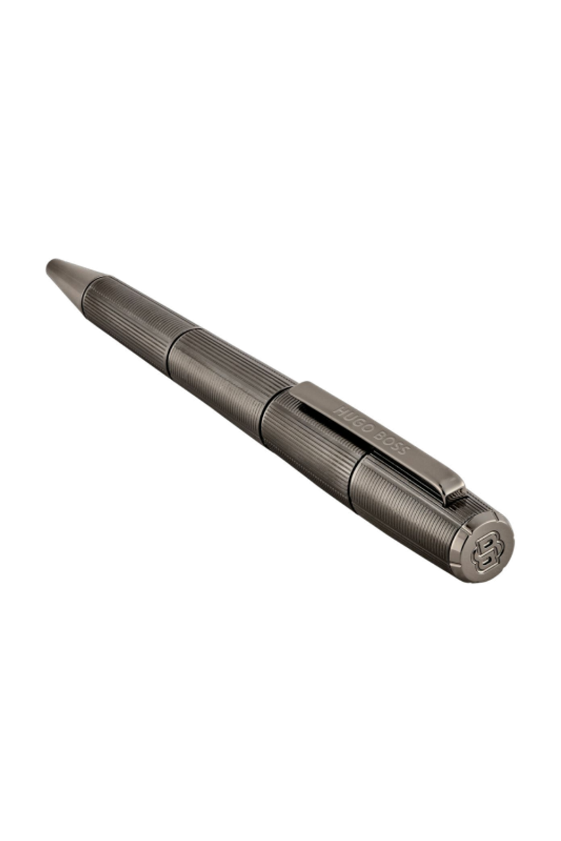 The Meridien pen reveals a futuristic, angular silhouette defined by a precise sequence of vertical and horizontal deep-engraved stripes. This graphic interplay forms a modern interpretation of the timeless herringbone pattern, giving the pen a sense of movement and structure. The minimal matte gunmetal plating reinforces its clean geometry, resulting in a piece that feels confidently modern and distinctly architectural.