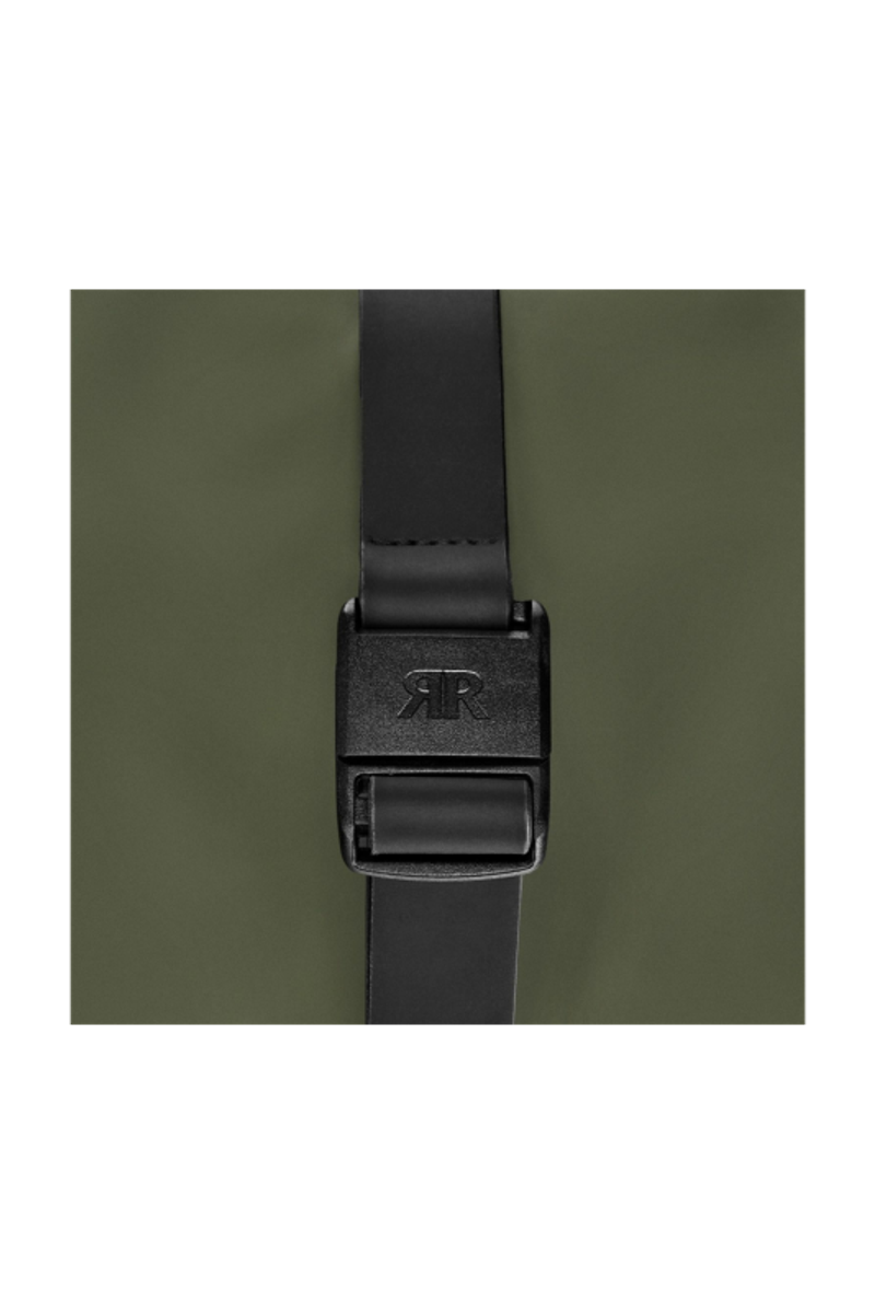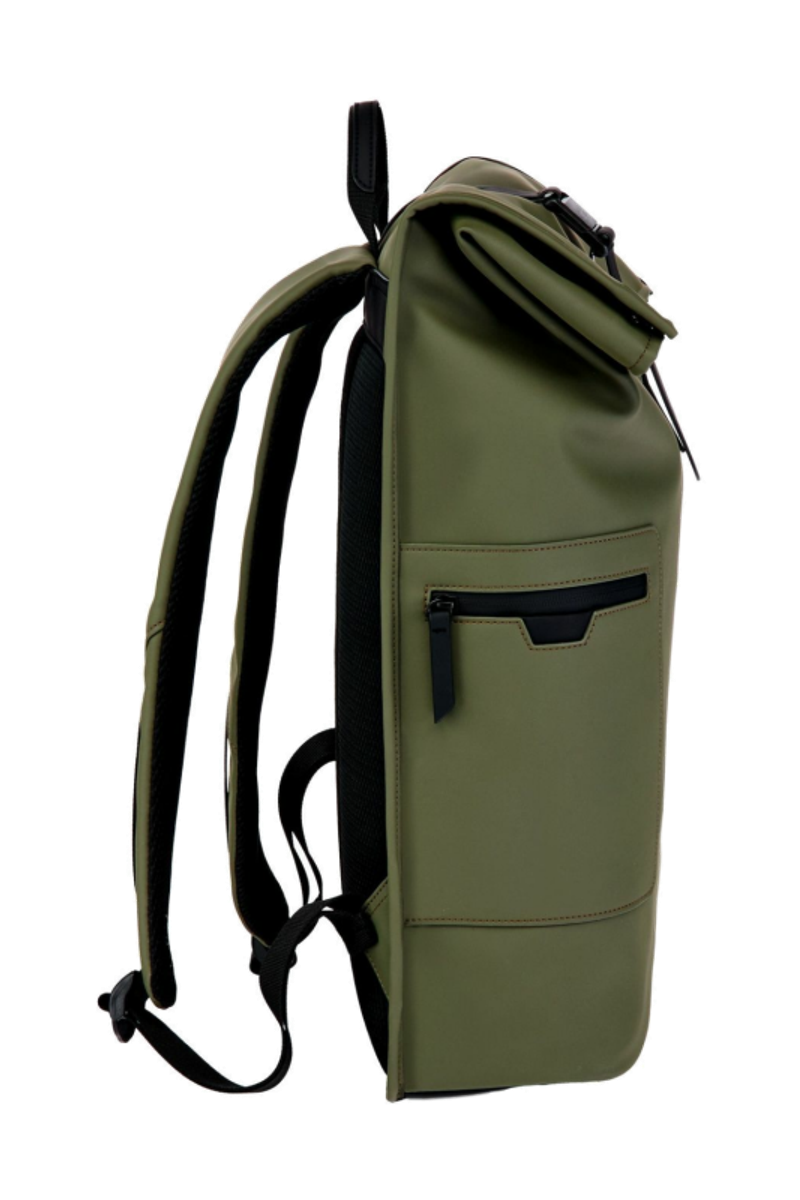 Designed with form as much as function in mind, this casual-inspired rolled-top backpack is offered in a refined khaki green, contrasted with elegant black matte details. A subtle utilitarian aesthetic is expressed through its rolled-top closing construction, perfectly finished with an integrated magnetic closure engraved with the RR signature. The silhouette is light and roamy, ideal for daily movement. Two flat zipped pockets to the front provide practical organization, while the interior features a dedicated laptop compartment for everyday essentials. A padded back panel and padded shoulder straps ensure lasting comfort in use. Inside, a spacious roamy interior reveals a refined monogram lining, completed with a zipped inner pocket for secure storage. It is the perfect accessory for someone with a minimalist yet casual and modern aesthetic.