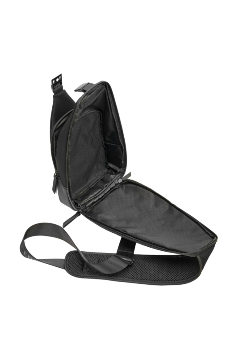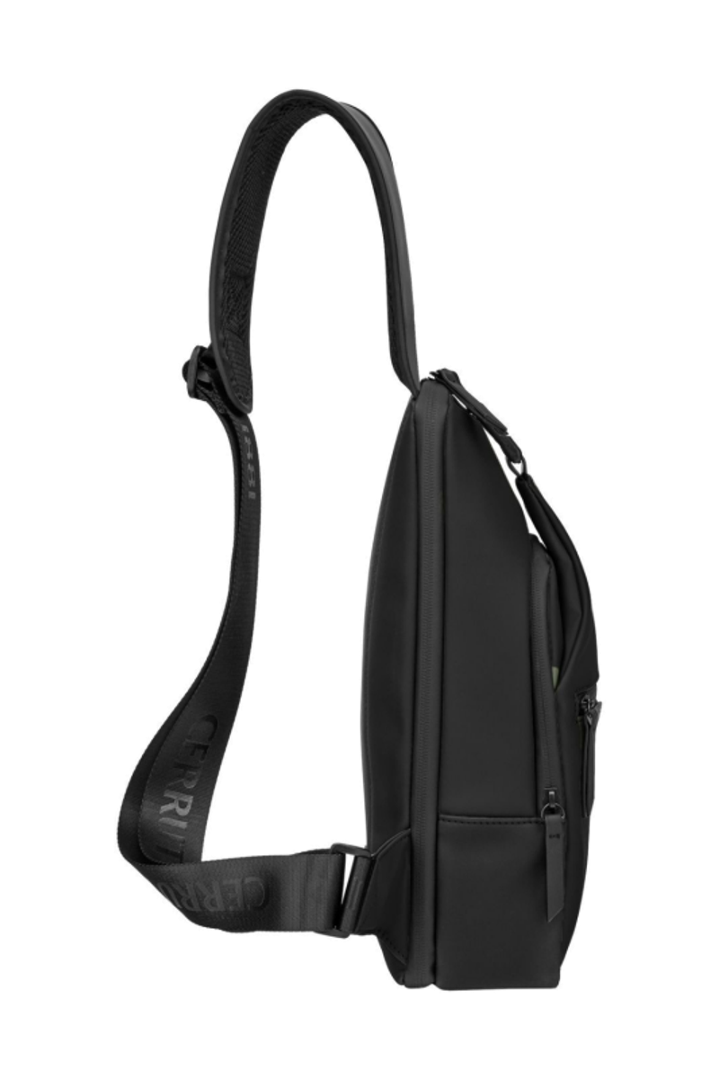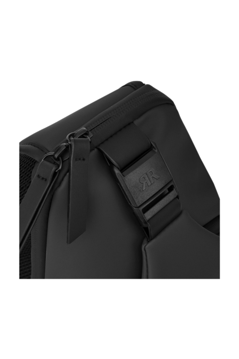 Designed with form as much as function in mind, this casual-inspired crossbody bag is expressed in timeless black, paired with all-black trims for a clean, monochrome attitude. A subtle utilitarian aesthetic is expressed through its clean structure and perfectly integrated black magnetic closure, engraved with the RR signature. The single strap is adaptable in size, allowing effortless wear as a crossbody. Its compact yet organized volume is designed for daily essentials, featuring two distinct compartments for intuitive separation. Inside, the interior is fully monogrammed, reinforcing the refined identity of the line. Light and roamy in spirit, it is the perfect accessory for someone with a minimalist yet casual and modern aesthetic.
