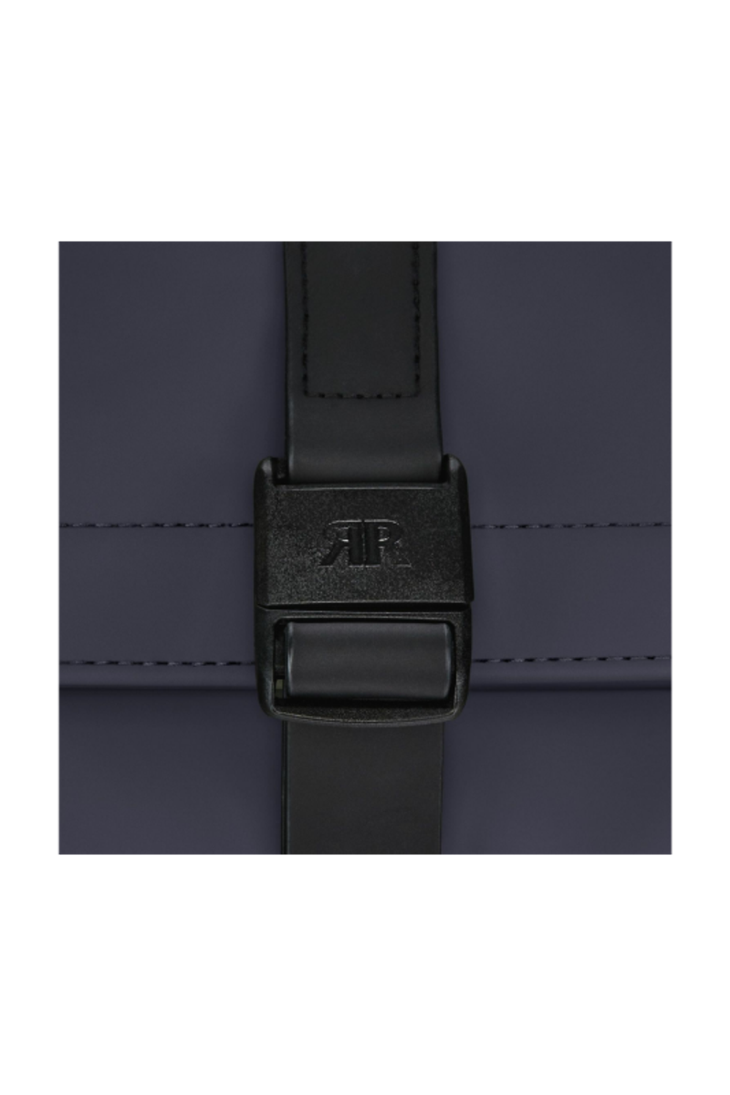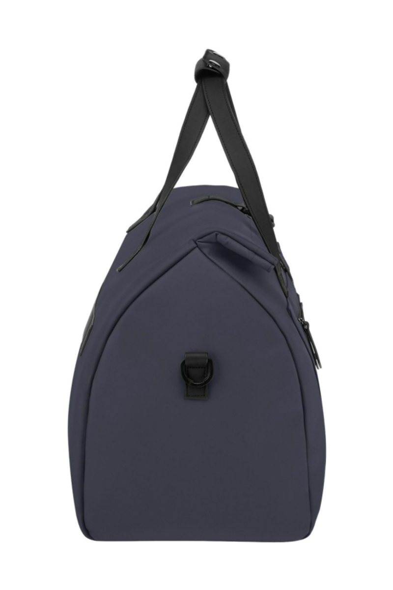 Designed with form as much as function in mind, this casual-inspired weekend bag is rendered in a deep navy tone, elevated by elegant black matte details. A subtle utilitarian aesthetic is expressed through its rolled-top closing construction, perfectly finished with an integrated magnetic closure engraved with the RR signature. The silhouette is light and roamy, created for effortless movement and everyday escape. A flat pocket to the front ensures easy access, while the detachable webbing strap allows adaptable carry. Inside, a spacious roamy interior reveals a refined monogram lining, finished with a zipped inner pocket for secure organization. It is the perfect accessory for someone with a minimalist yet casual and modern aesthetic.