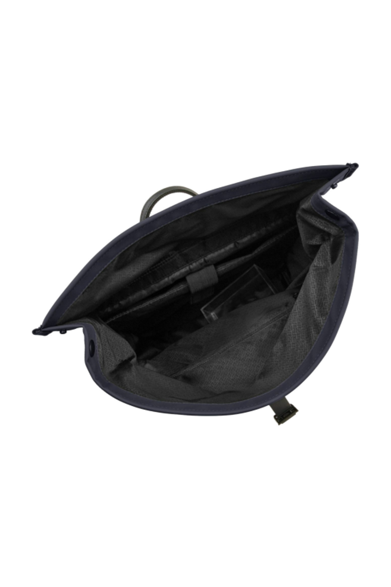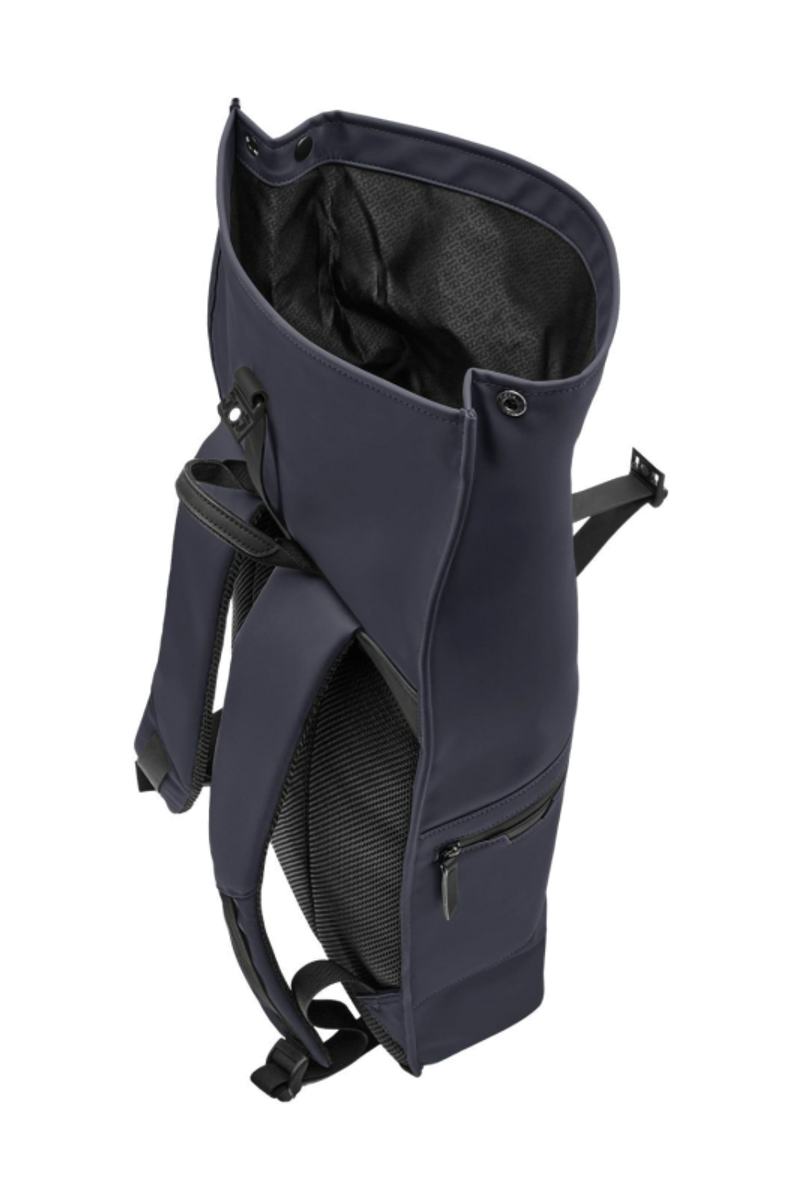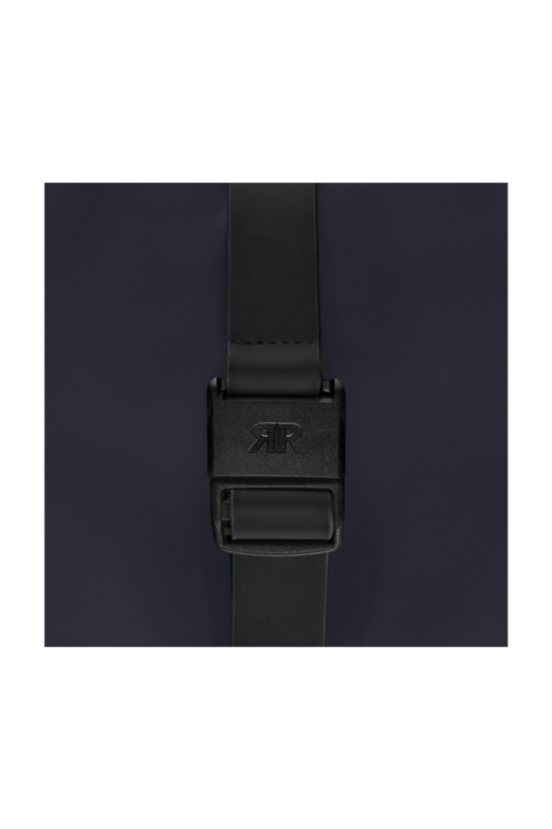 Designed with form as much as function in mind, this casual-inspired rolled-top backpack is rendered in a deep navy tone, elevated by elegant black matte details. A subtle utilitarian aesthetic is expressed through its rolled-top closing construction, perfectly finished with an integrated magnetic closure engraved with the RR signature. The silhouette is light and roamy, ideal for daily movement. Two flat zipped pockets to the front provide practical organization, while the interior features a dedicated laptop compartment for everyday essentials. A padded back panel and padded shoulder straps ensure lasting comfort in use. Inside, a spacious roamy interior reveals a refined monogram lining, completed with a zipped inner pocket for secure storage. It is the perfect accessory for someone with a minimalist yet casual and modern aesthetic.